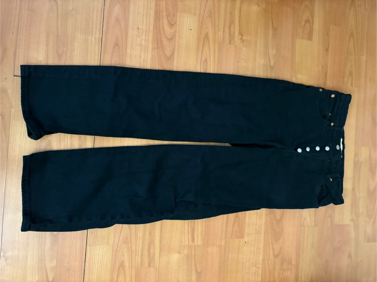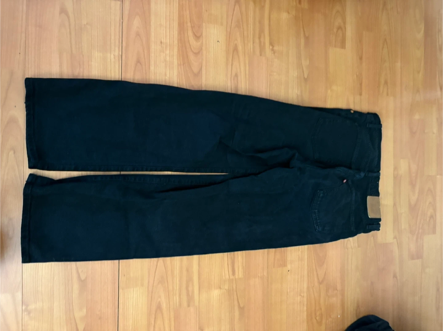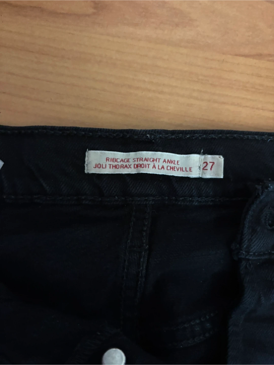 These are black Levi's Ribcage Straight Ankle jeans. They're a size 27 in good condition, well-loved only a bit lighter on one pocket (included in picture).