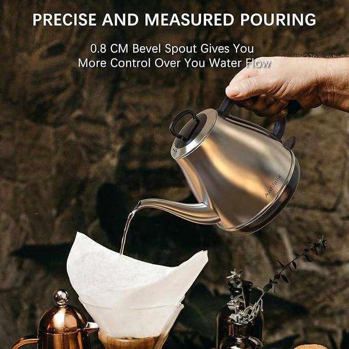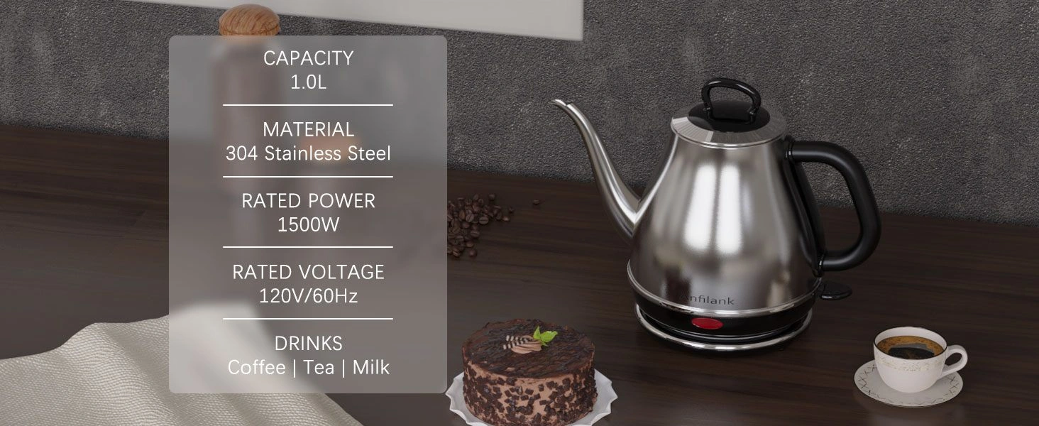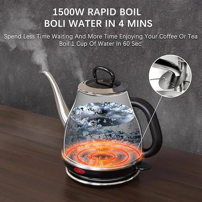 Description: Electric Gooseneck Kettle, 1L 1500W Fast Boil, 100% Stainless Steel BPA Free Pour-Over Coffee & Tea Kettle, Water Boiler with Auto Shut & Boil-Dry Protection, Silver