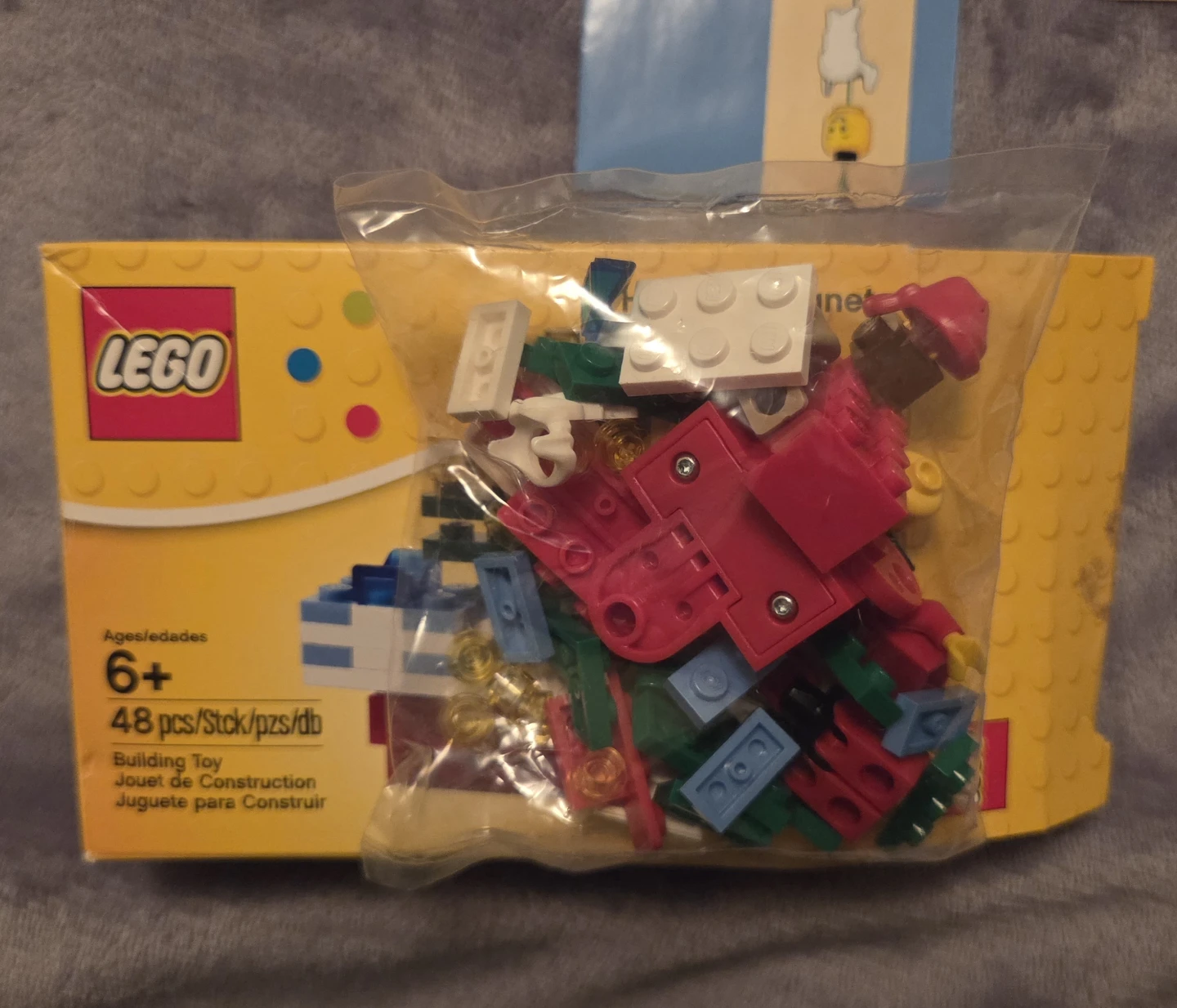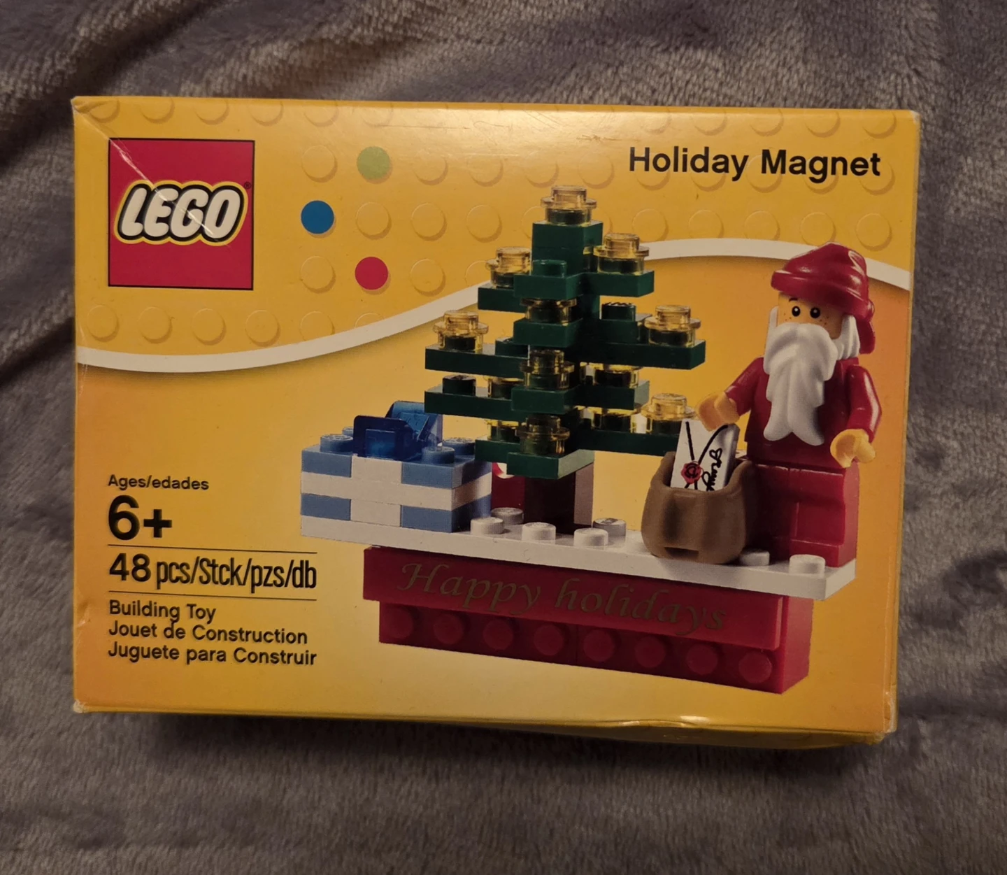 LEGO Holiday Magnet building toy. It's a set with 48 pieces for ages 6 and up. Includes instructions and a festive holiday message.