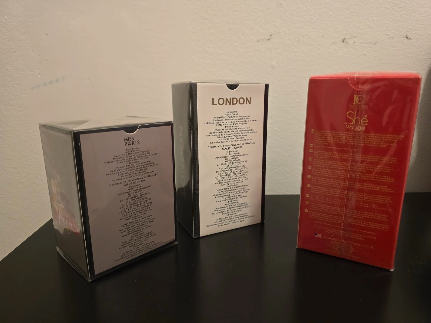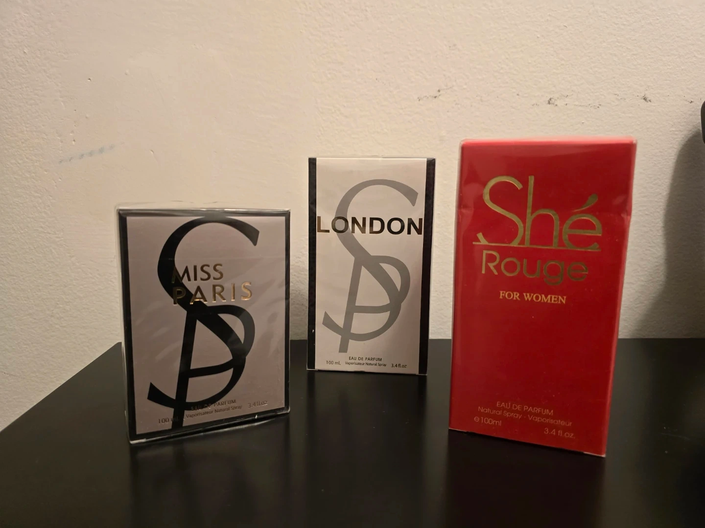 Three Eau de Parfum sprays for women. Includes Miss Paris, London, and She Rouge scents. Each bottle is 100ml (3.4 fl.oz.). Made in France. These fragrances are great for everyday wear or special occasions! These are from Fragrance Couture and Secret Plus.