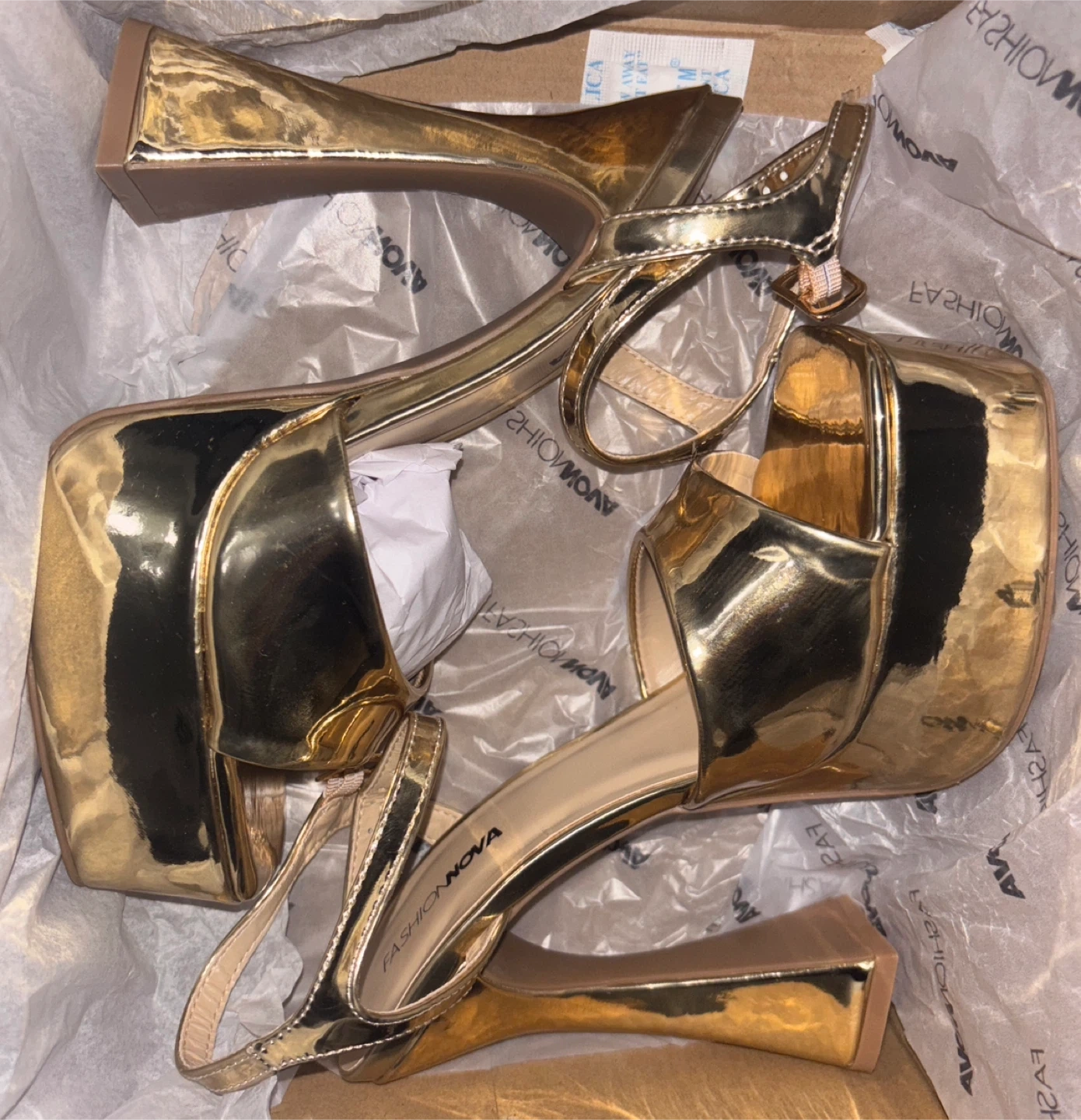 Selling a pair of Fashion Nova gold platform heels in size 7.5, never worn. These heels are sure to make a statement!