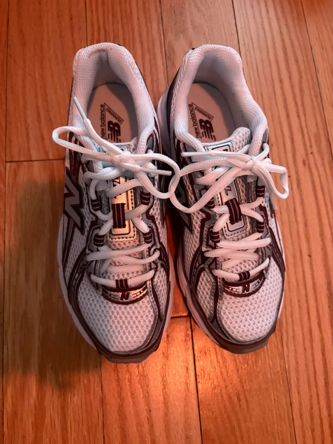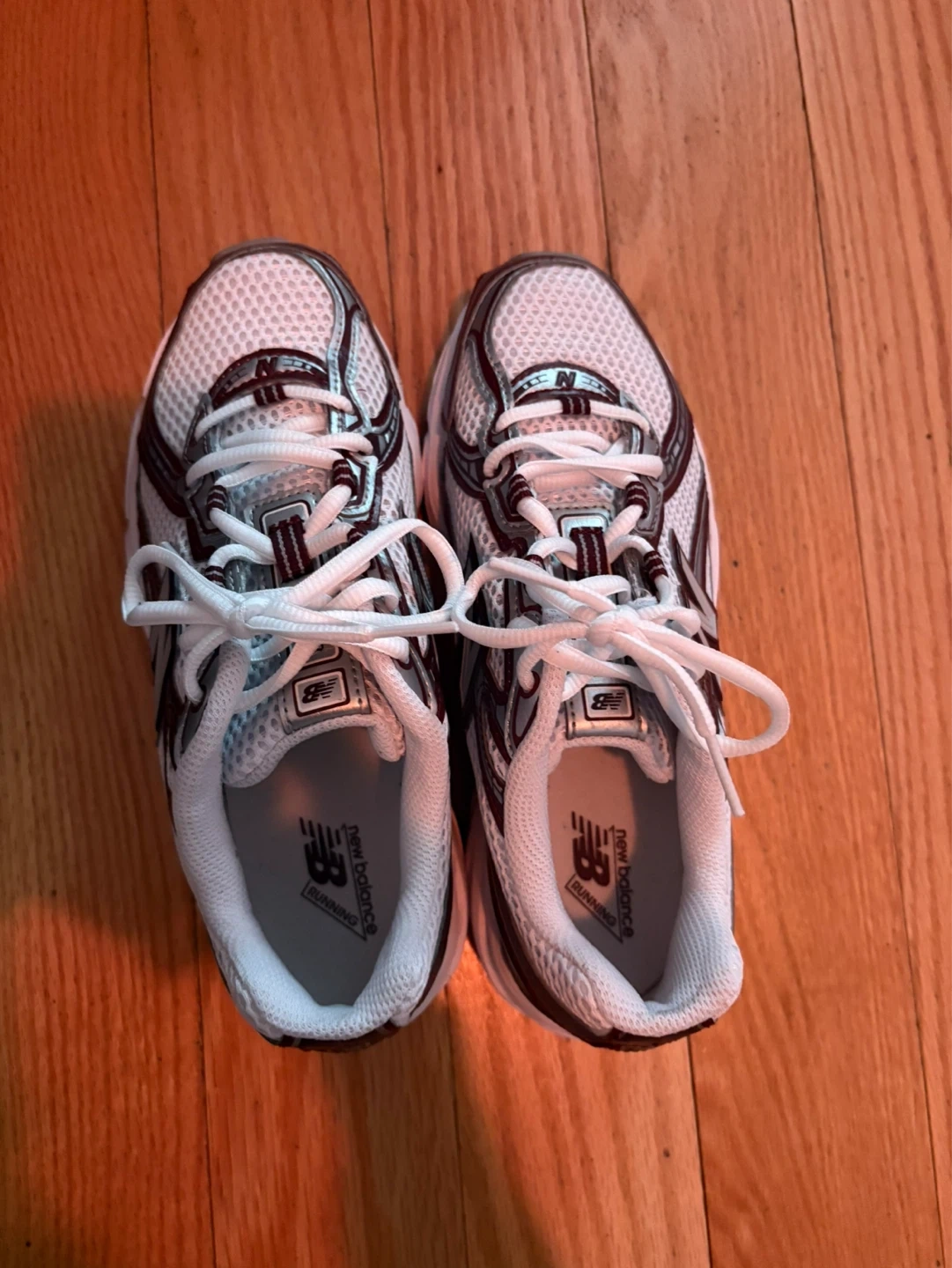 White and maroon New Balance running shoes. Mesh upper with cushioned sole. Suitable for athletic activities.