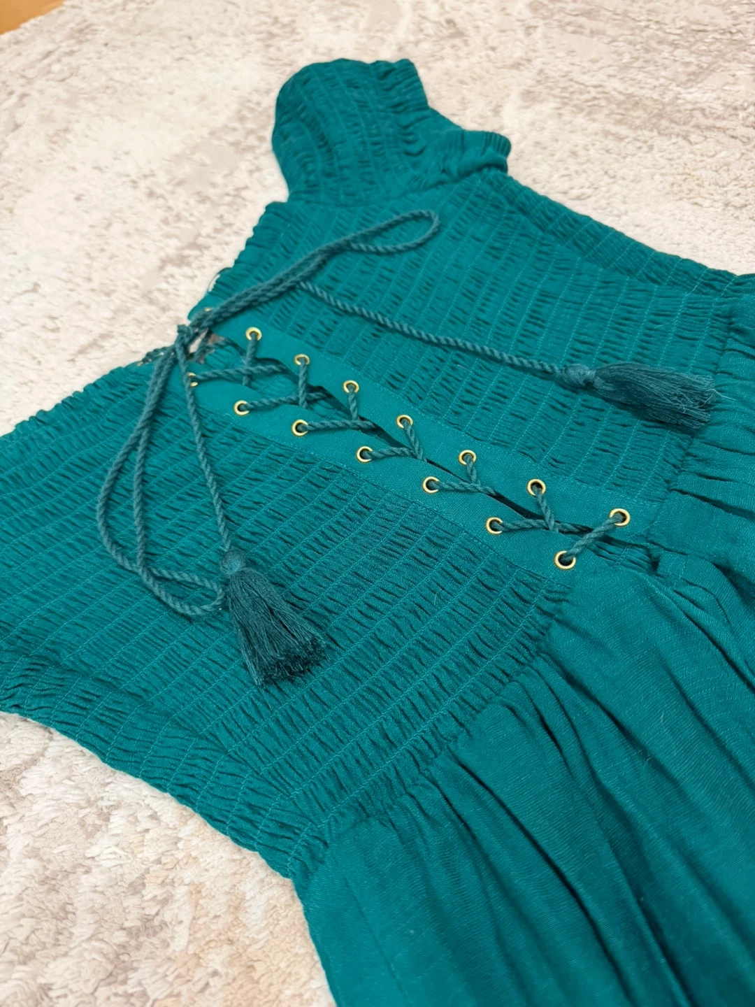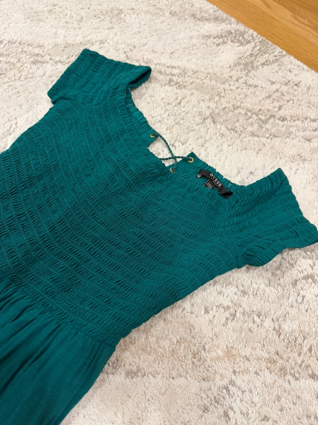 This is a cute Guess aqua green off-the-shoulder jumpsuit, size small.It features a smocked bodice and wide legs. Perfect for a casual day out or a summer evening!