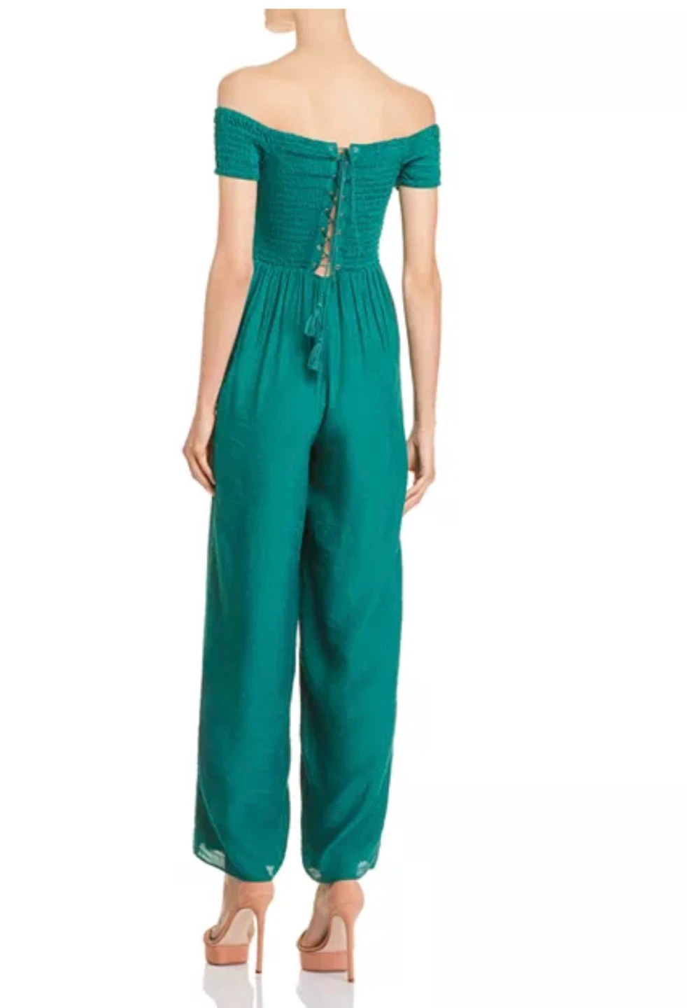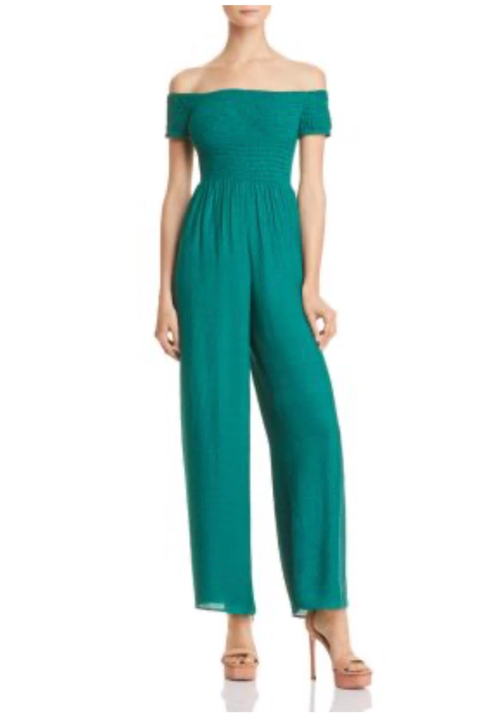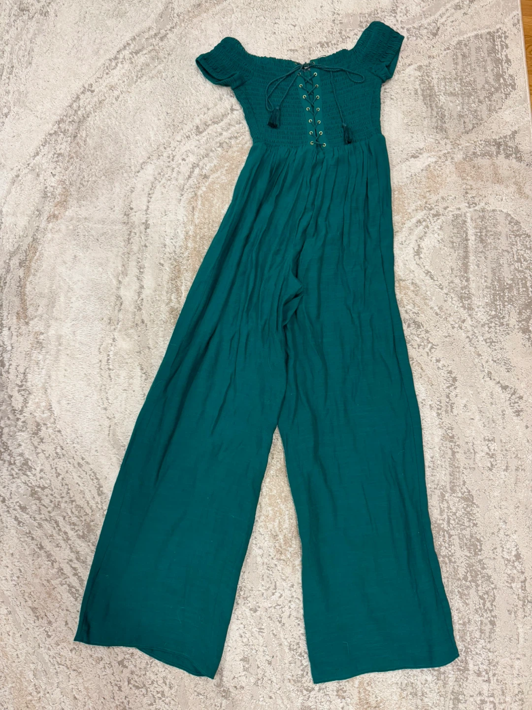 This is a cute Guess aqua green off-the-shoulder jumpsuit, size small.It features a smocked bodice and wide legs. Perfect for a casual day out or a summer evening!