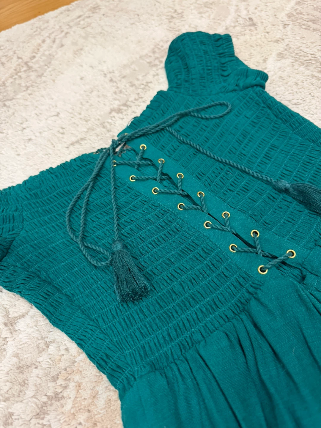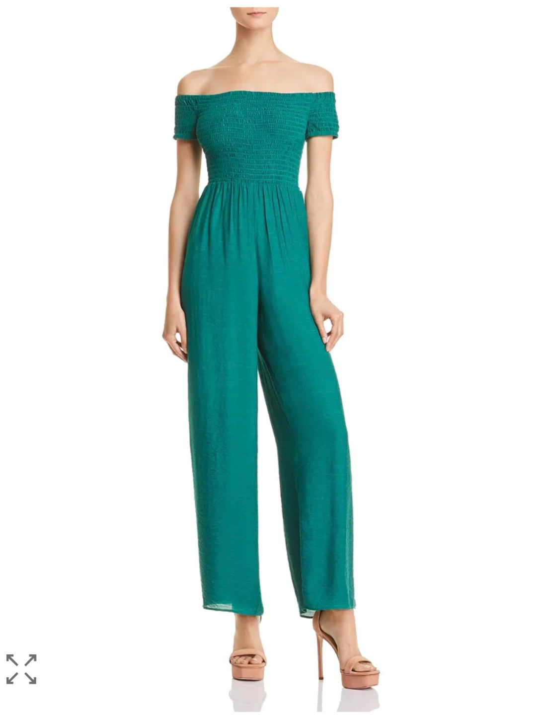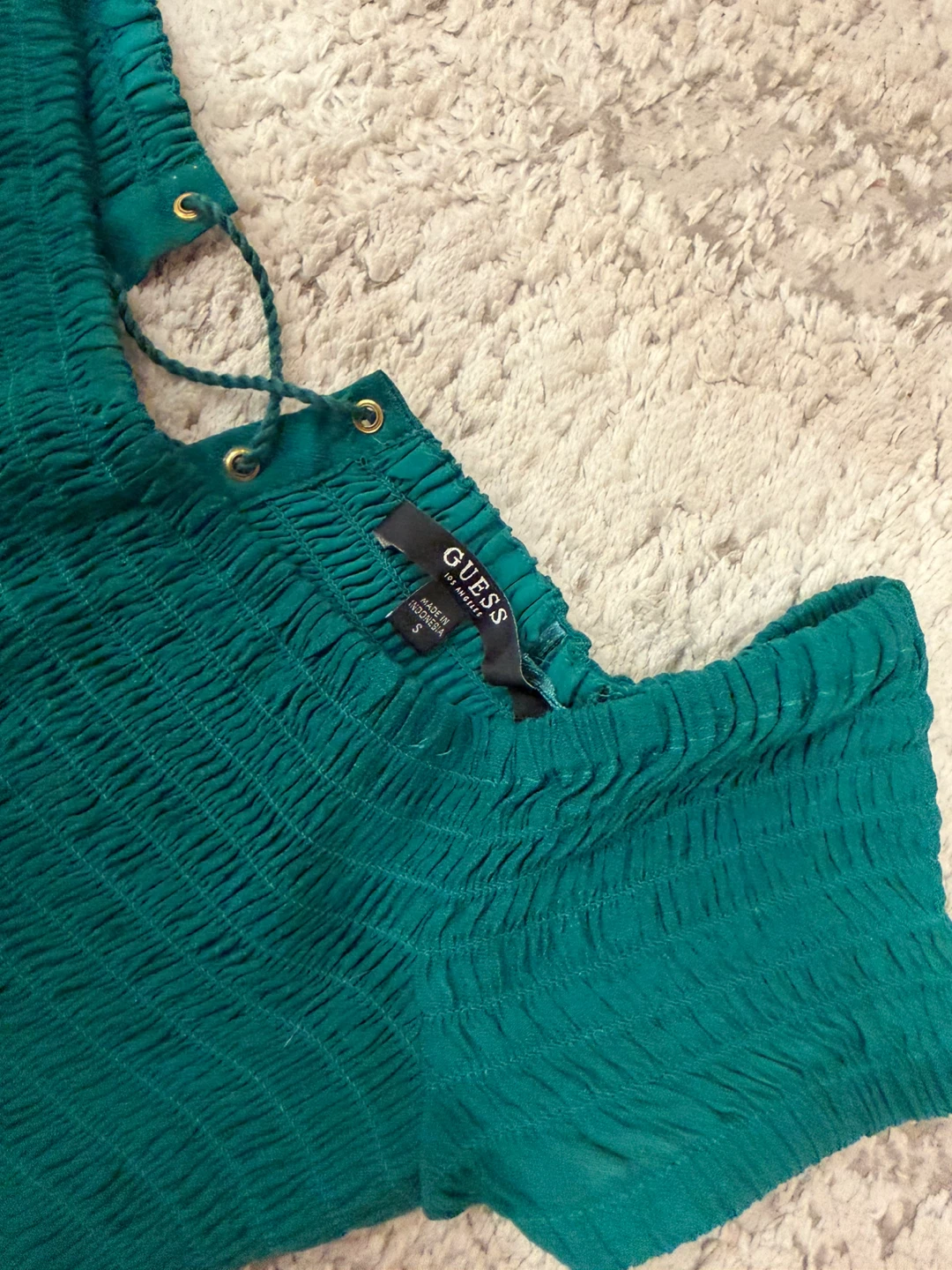 This is a cute Guess aqua green off-the-shoulder jumpsuit, size small.It features a smocked bodice and wide legs. Perfect for a casual day out or a summer evening!