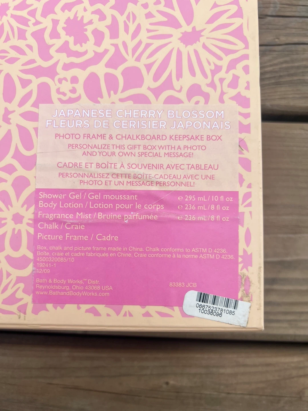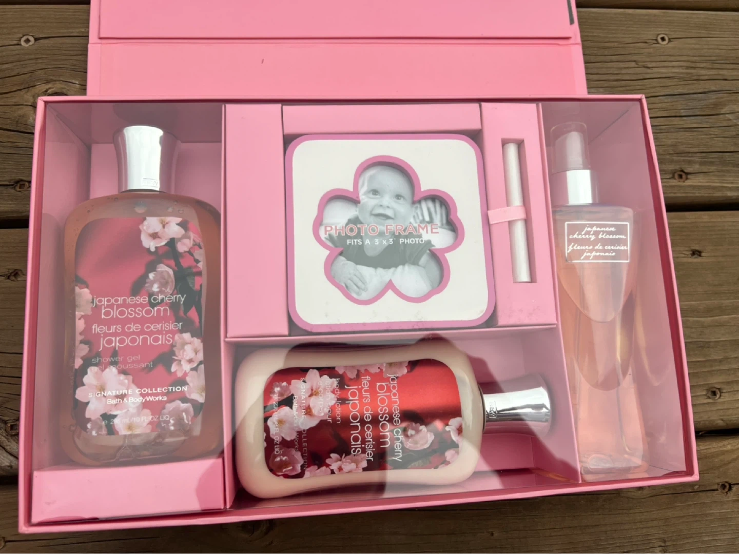 This Bath & Body Works gift box features Japanese Cherry Blossom shower gel, body lotion, and fragrance mist. It includes a photo frame and a chalkboard keepsake box for personal messages. A lovely gift set!