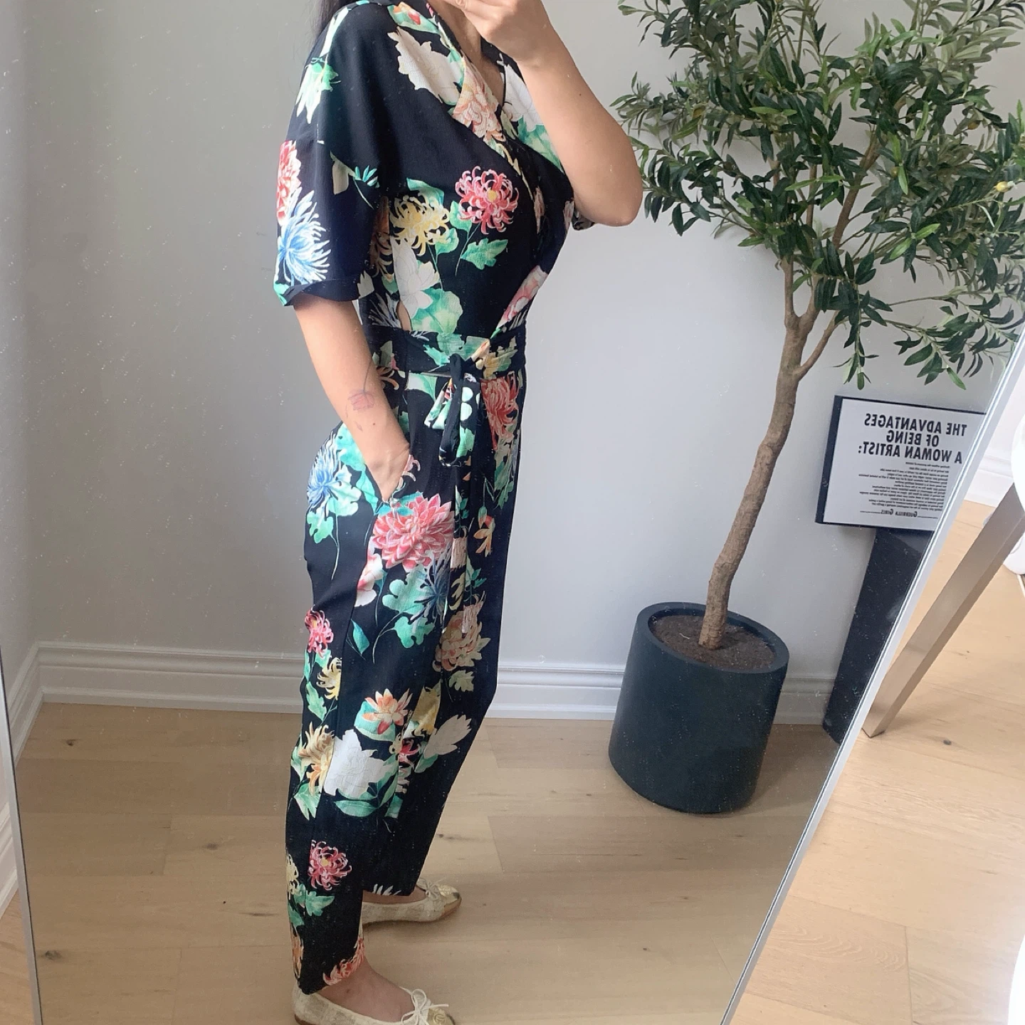 ZARA Black Floral Jumpsuit Size XS | Belted Waist