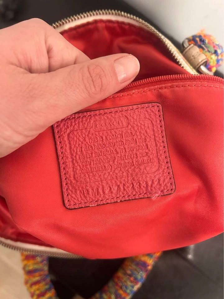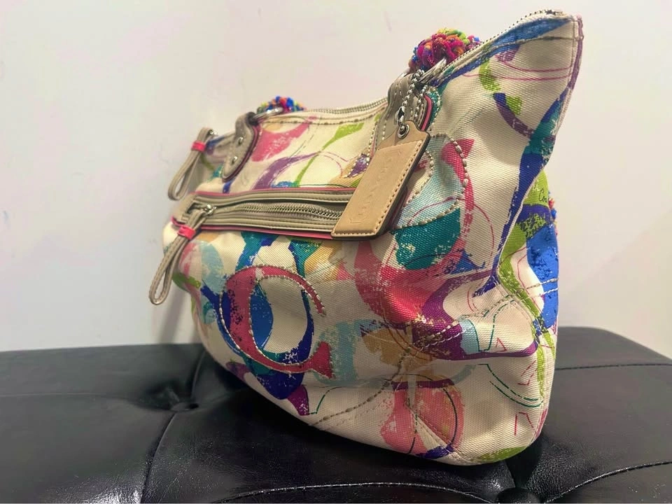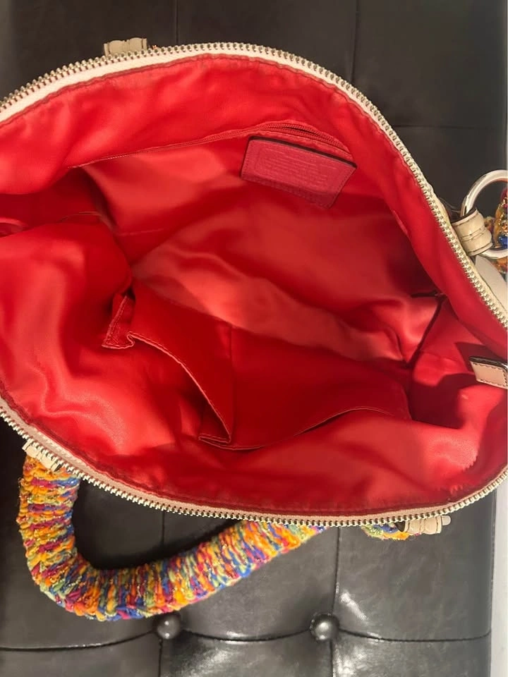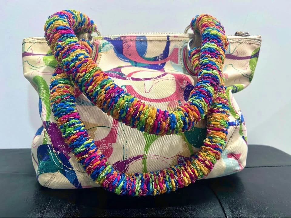 Customized Coach canvas tote with a cream base and multicolor print. Rainbow-wrapped crocheted handles add a whimsical touch. Bold & colorful. Design no 23372 (circa 2010). Both outside canvas and interior lining in great condition.