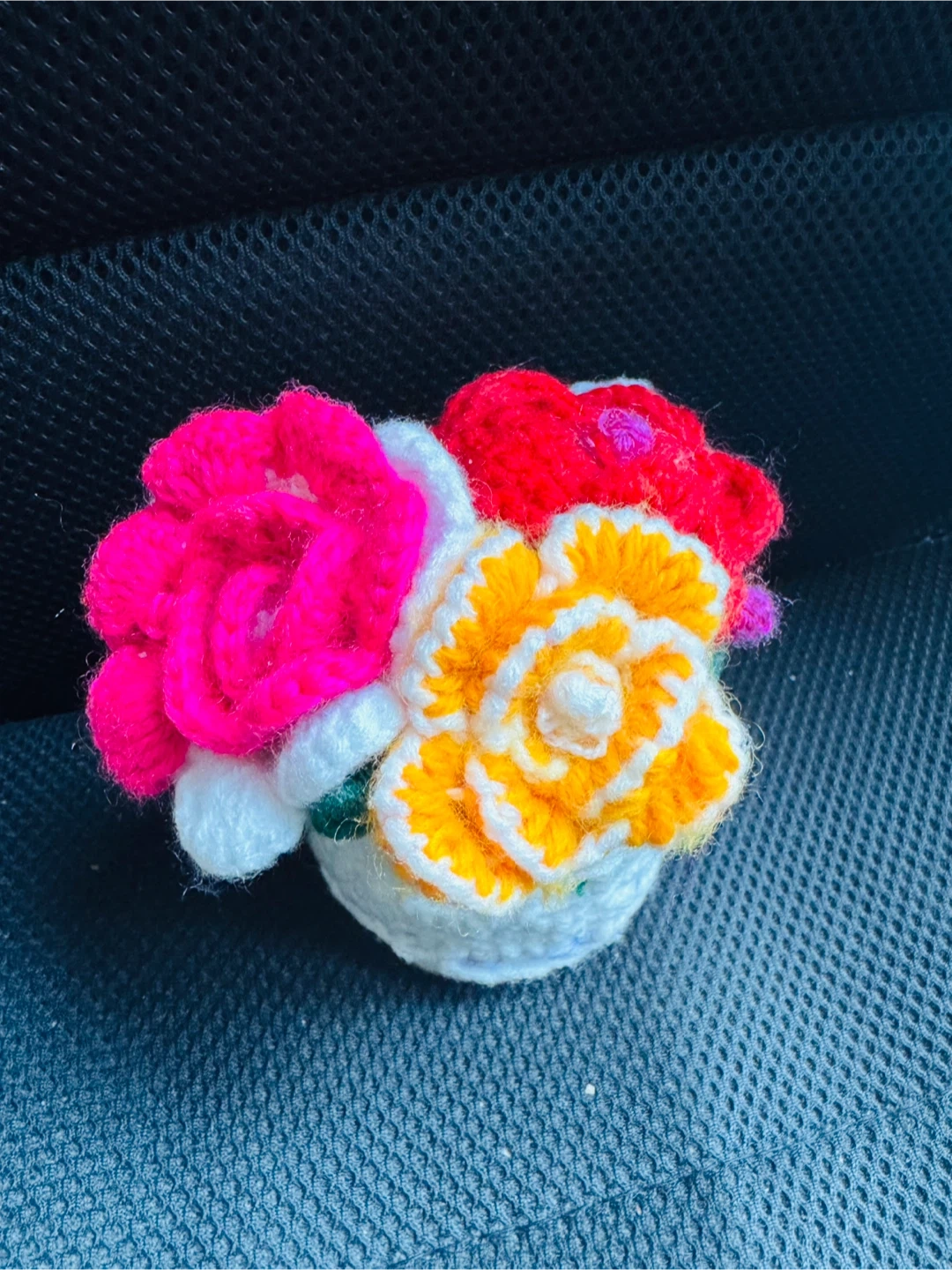 This is a cute, small, handmade crochet decoration featuring colourful flowers in a white pot. It's perfect for adding a pop of colour to a desk or shelf. The flowers are bright pink, yellow, and white with green leaves.