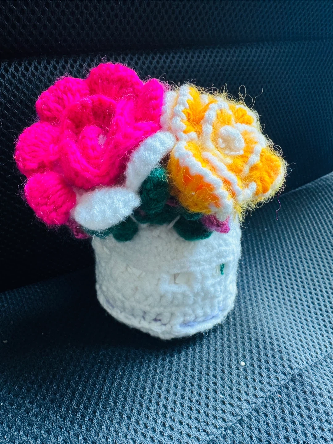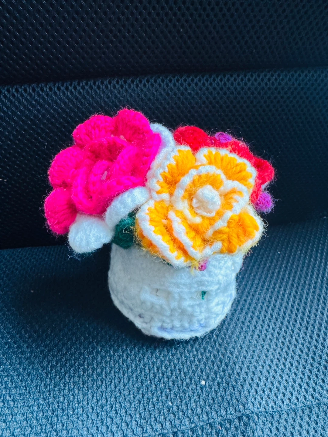 This is a cute, small, handmade crochet decoration featuring colourful flowers in a white pot. It's perfect for adding a pop of colour to a desk or shelf. The flowers are bright pink, yellow, and white with green leaves.