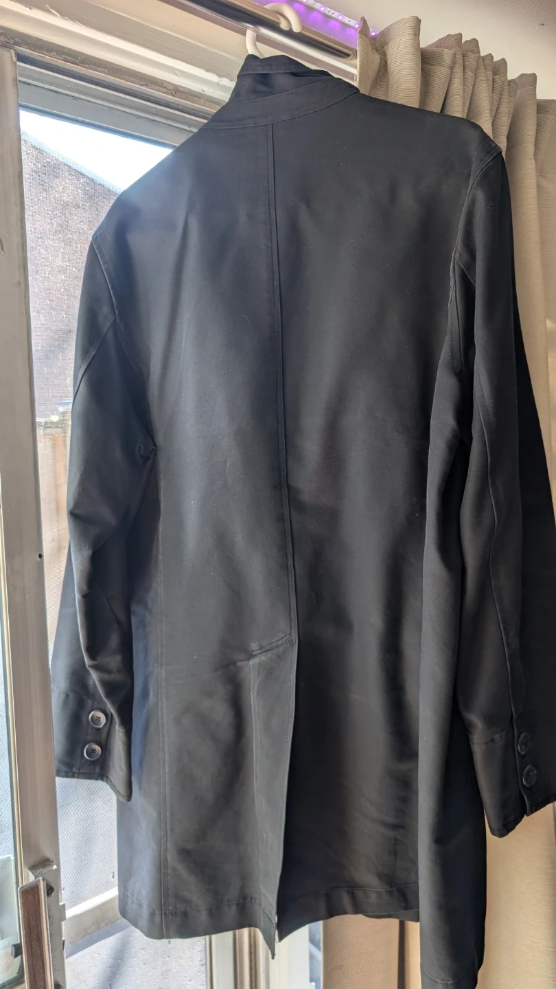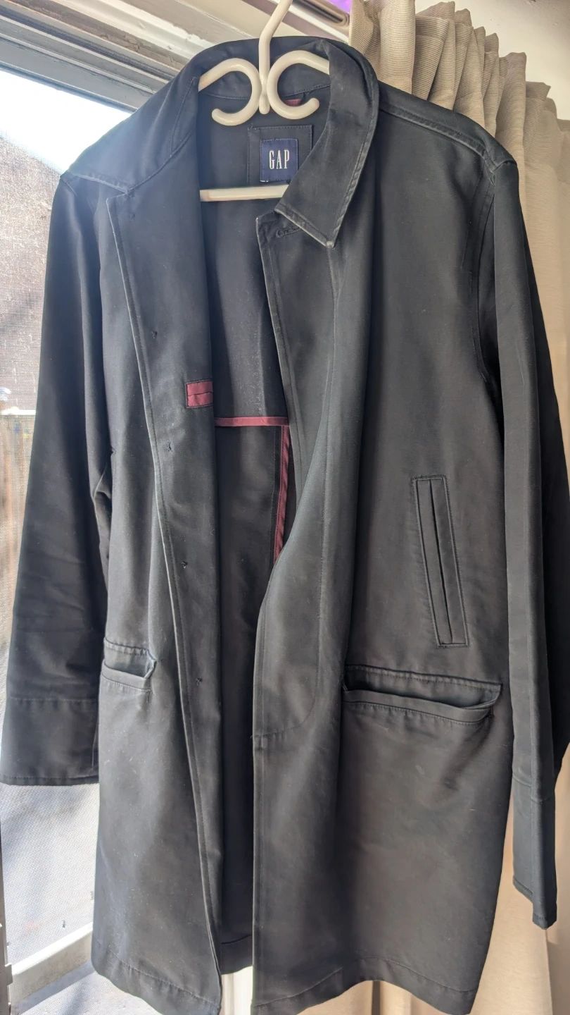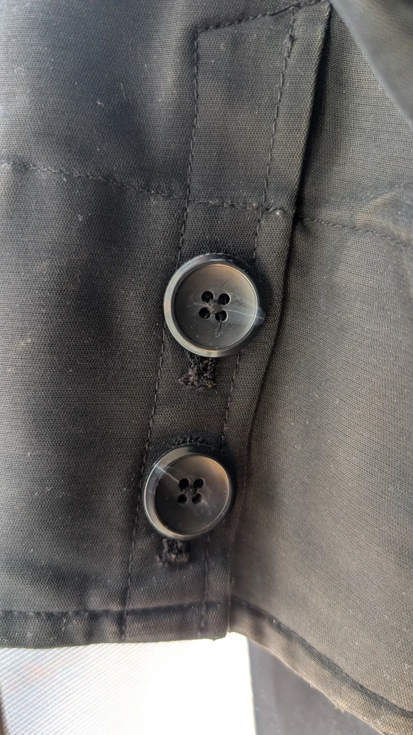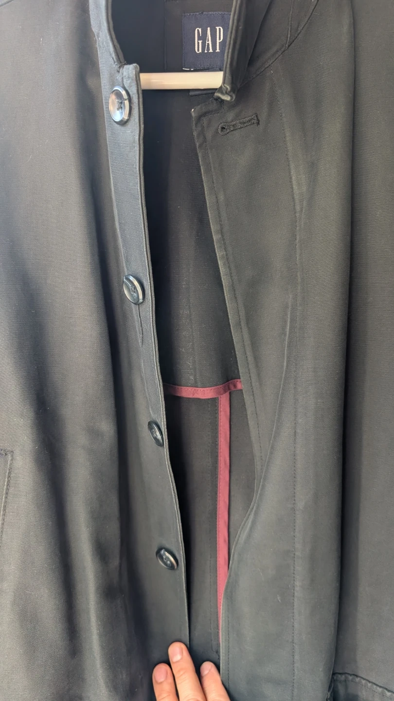 Classic black jacket from GAP. It's a medium weight but a Large size, perfect for transitional weather. Features two front pockets per side and button closures.