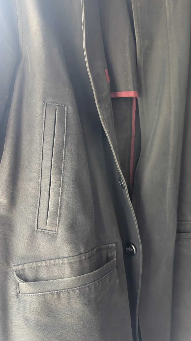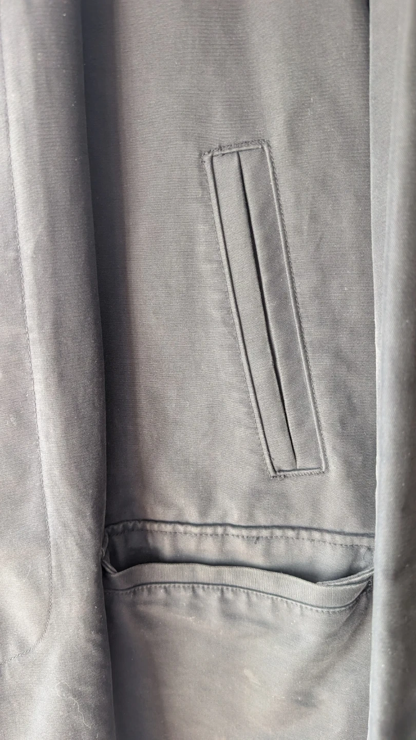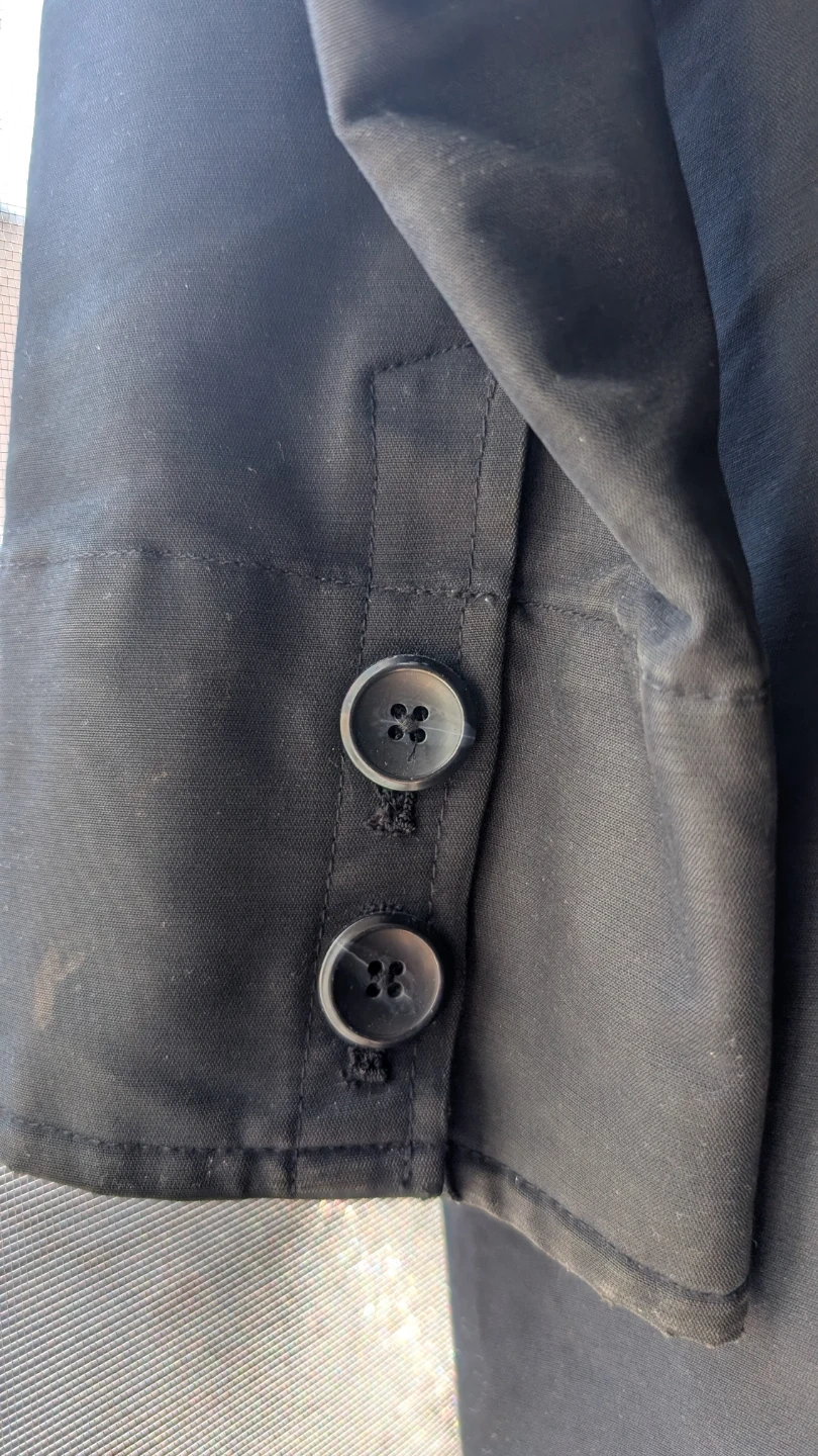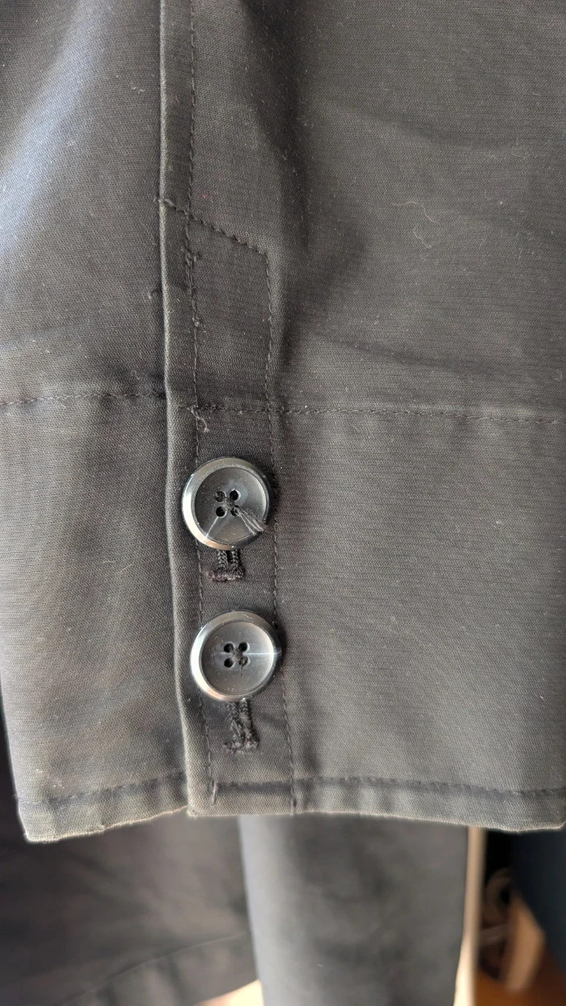 Classic black jacket from GAP. It's a medium weight but a Large size, perfect for transitional weather. Features two front pockets per side and button closures.