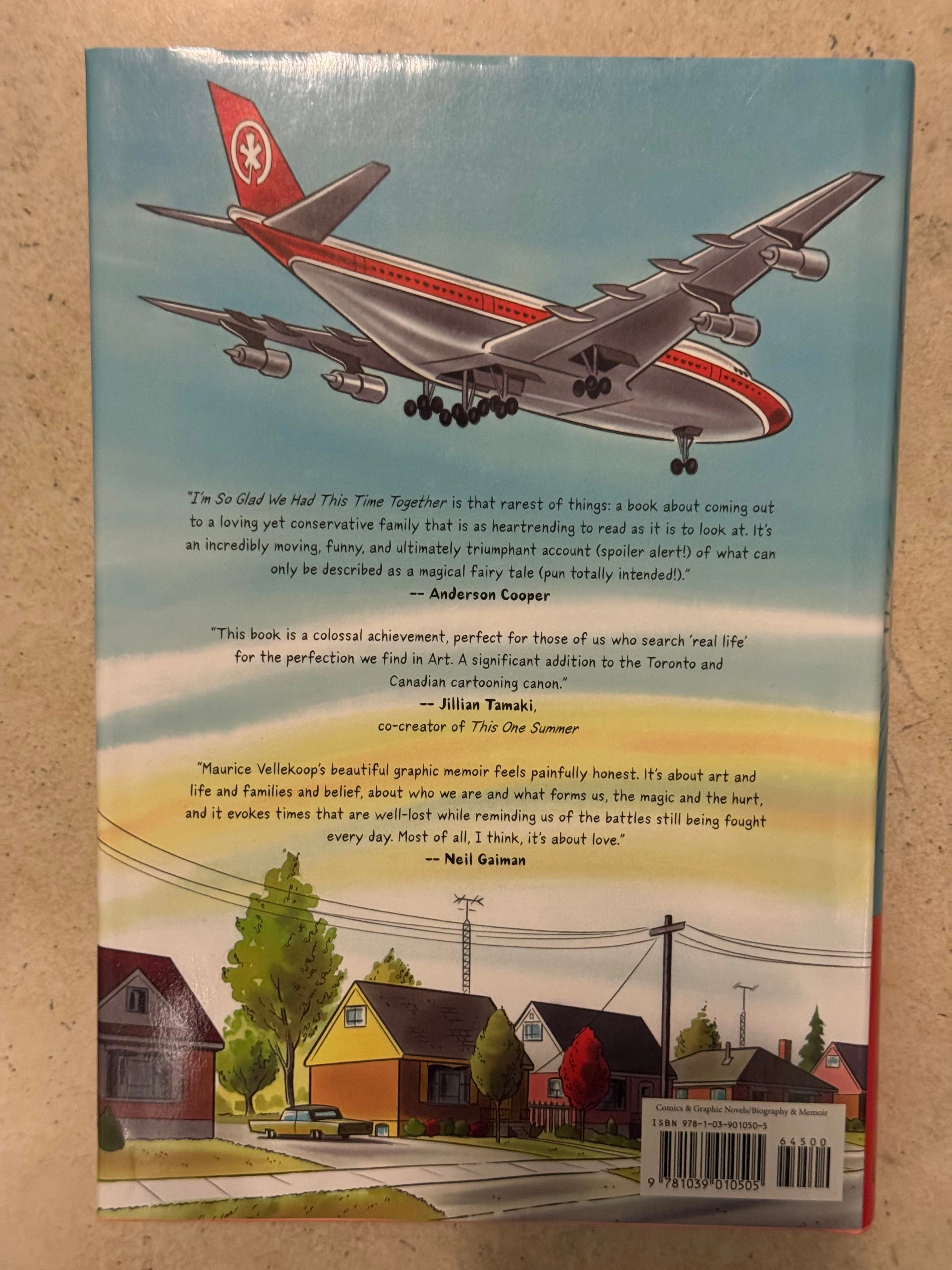 Brand new, never cracked, giftable hard cover. Selling the book 'I'm So Glad We Had This Time Together: A Memoir' by Maurice Vellekoop! It's a graphic memoir that's both heartwarming and thought-provoking, exploring themes of family, identity, and art. A great read for anyone interested in memoirs or Canadian cartooning!