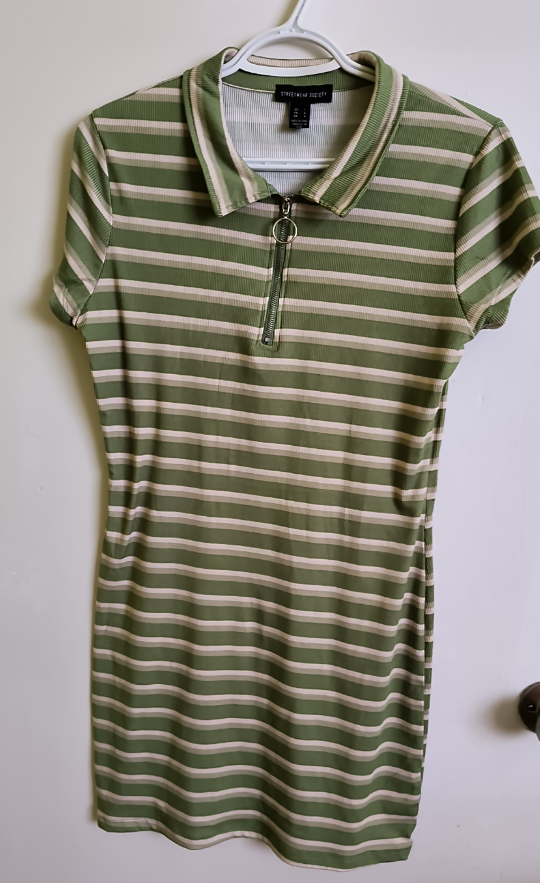 Green and white striped dress with a zipper. Short sleeves and a collared neckline. Size Large- Girls.