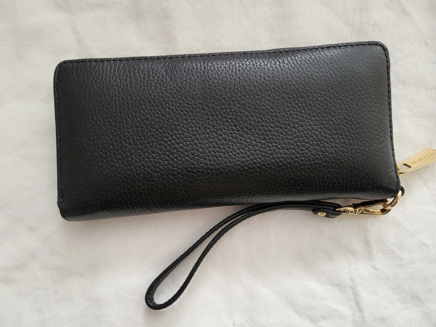 This is a Michael Kors wristlet wallet. It's black with gold-tone hardware. The wallet features multiple card slots and a zippered compartment. It's made of pebbled leather.