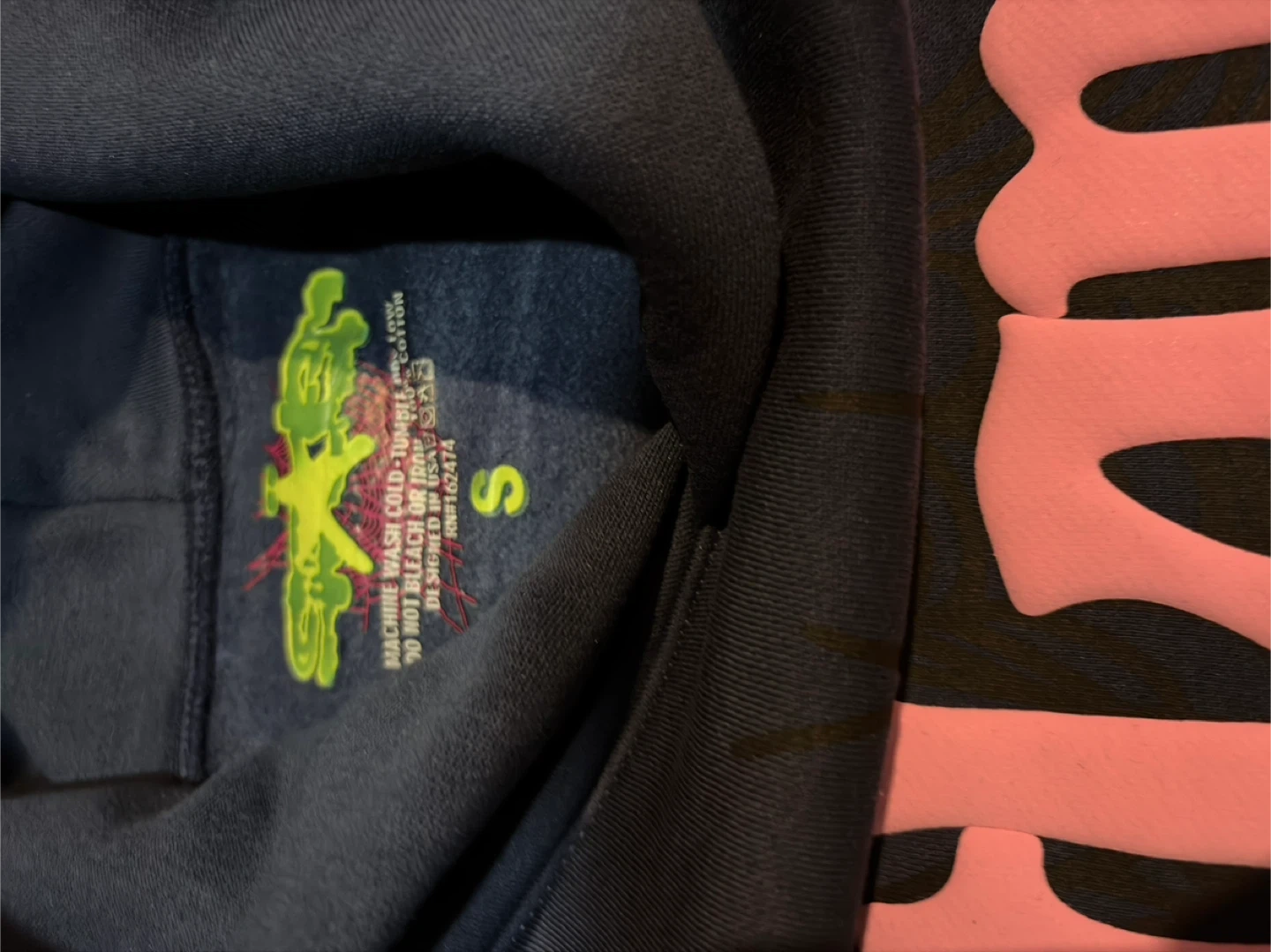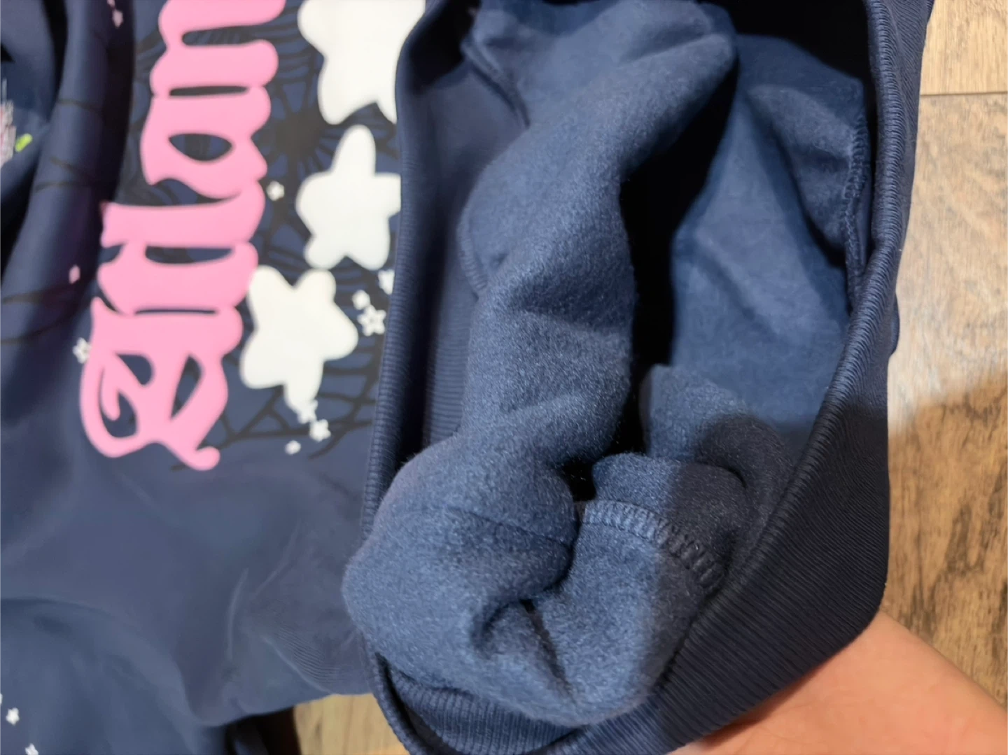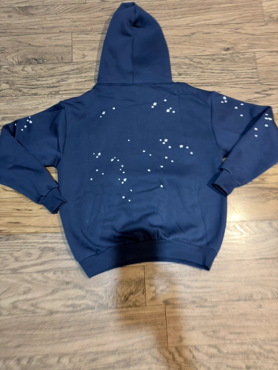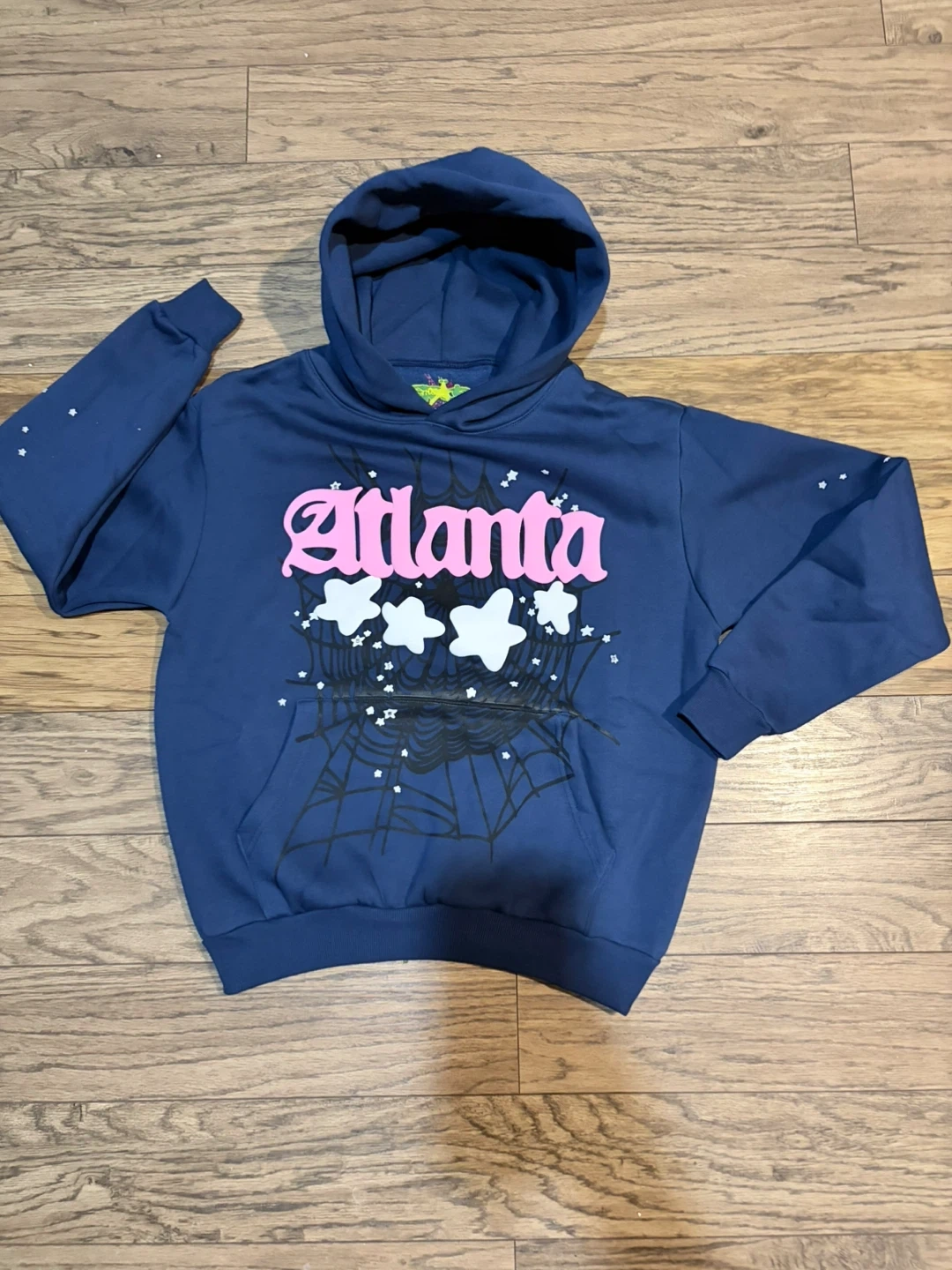 This is a blue graphic hoodie with an "Atlanta" design. It's made of cotton and has a size tag indicating "S". The hoodie is fleece-lined for extra warmth.