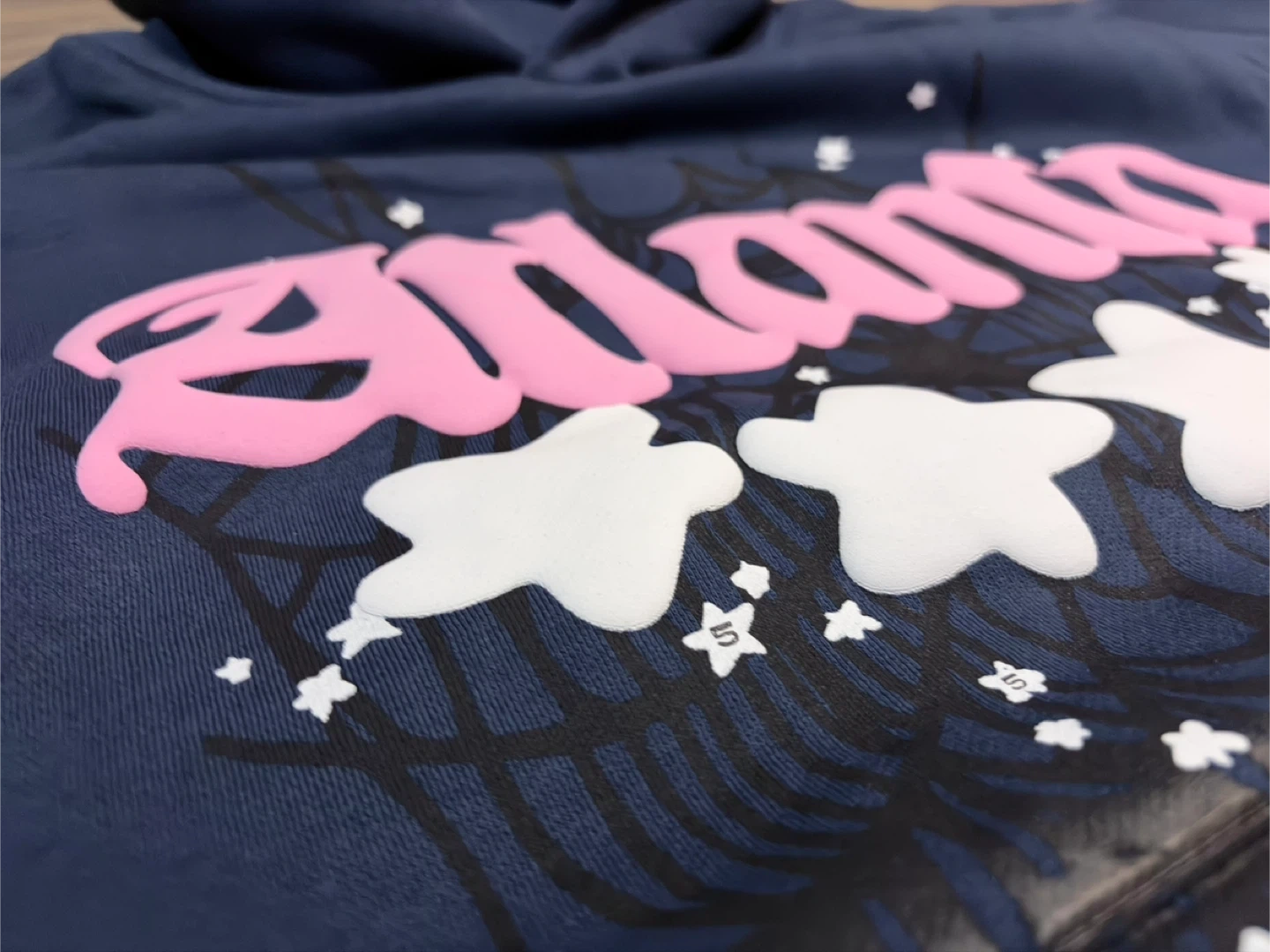 This is a blue graphic hoodie with an "Atlanta" design. It's made of cotton and has a size tag indicating "S". The hoodie is fleece-lined for extra warmth.