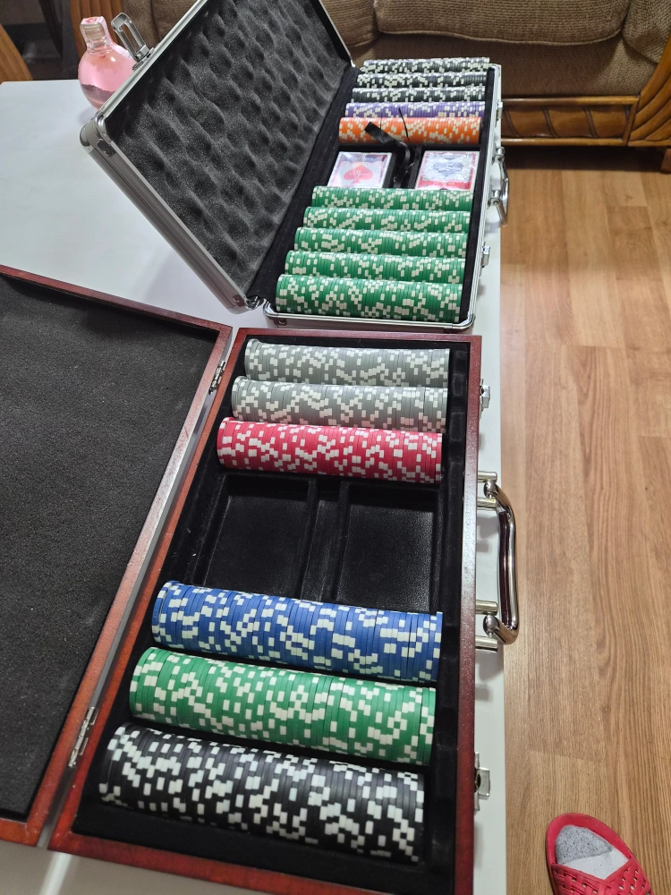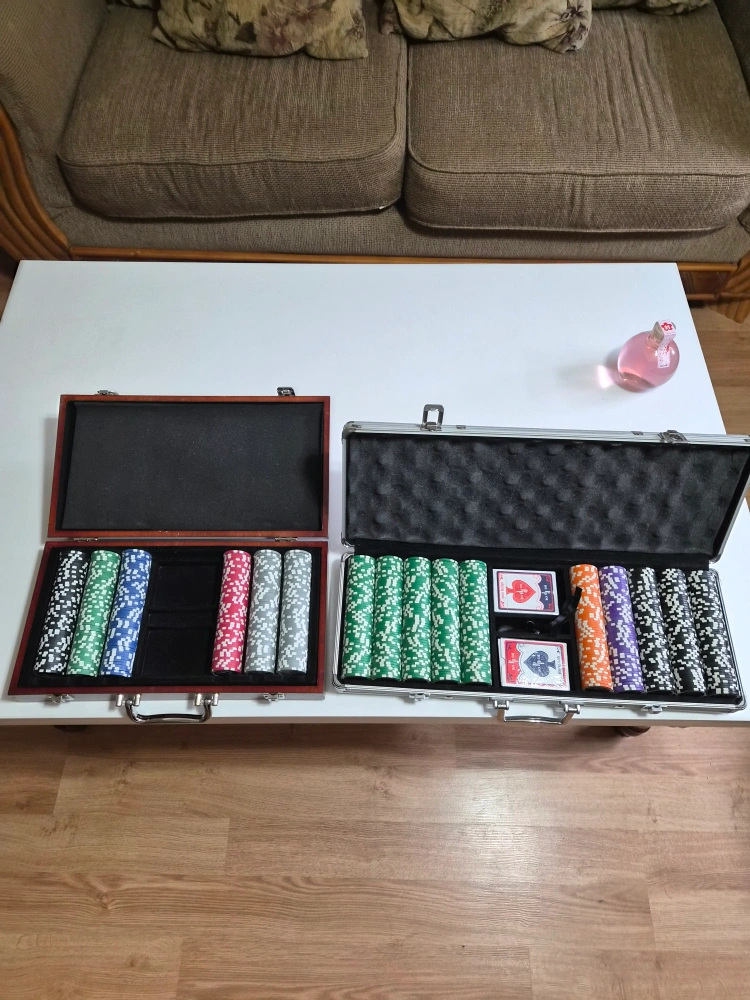 Selling a poker chip set that comes with a carrying case! The set includes a variety of coloured chips and playing cards, everything you need for a fun game night with friends and family