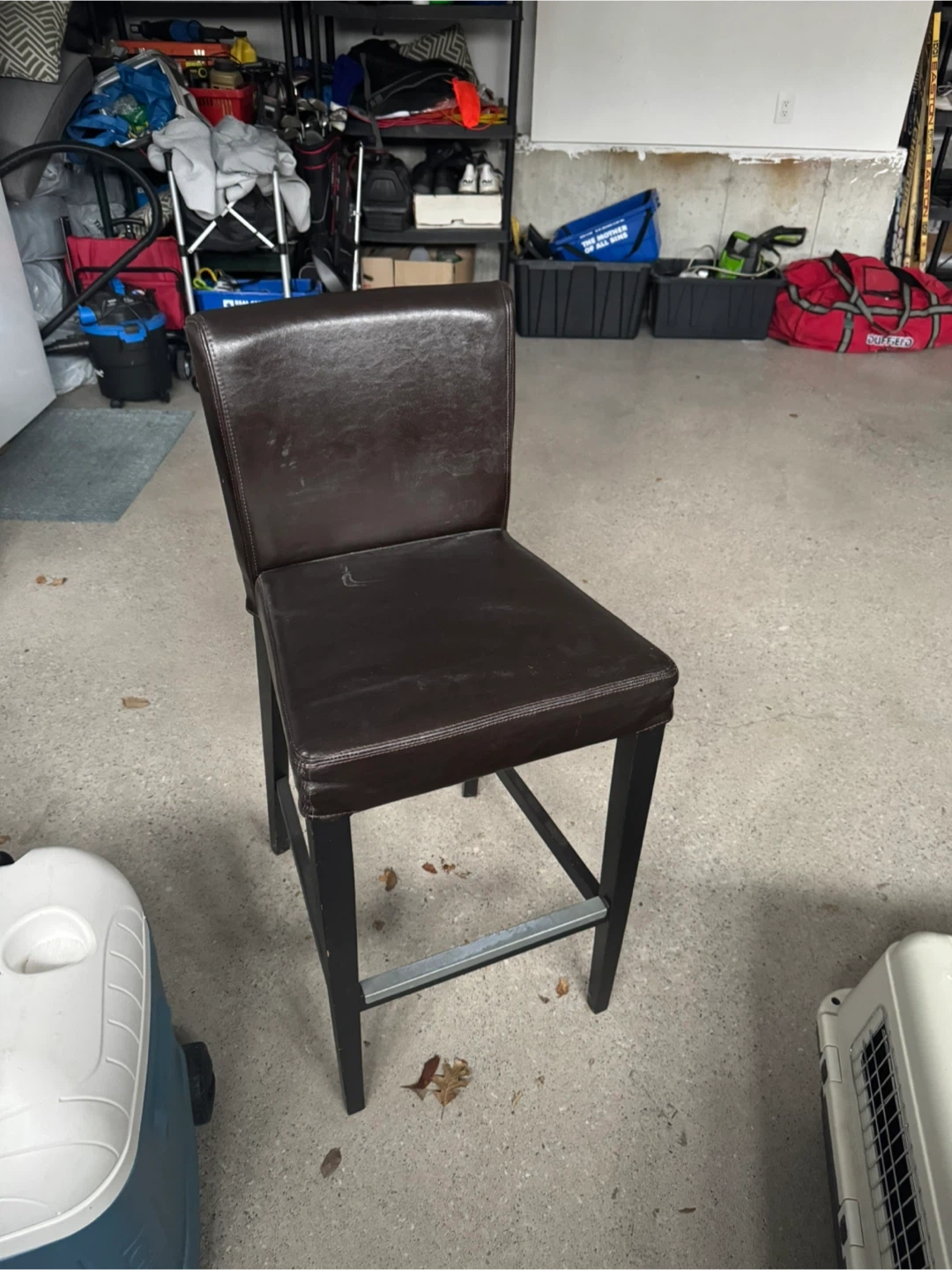 A single bar stool with dark brown faux leather upholstery and black wooden legs. It features a metal footrest for added stability. This stool would work well at a kitchen island or a home bar.