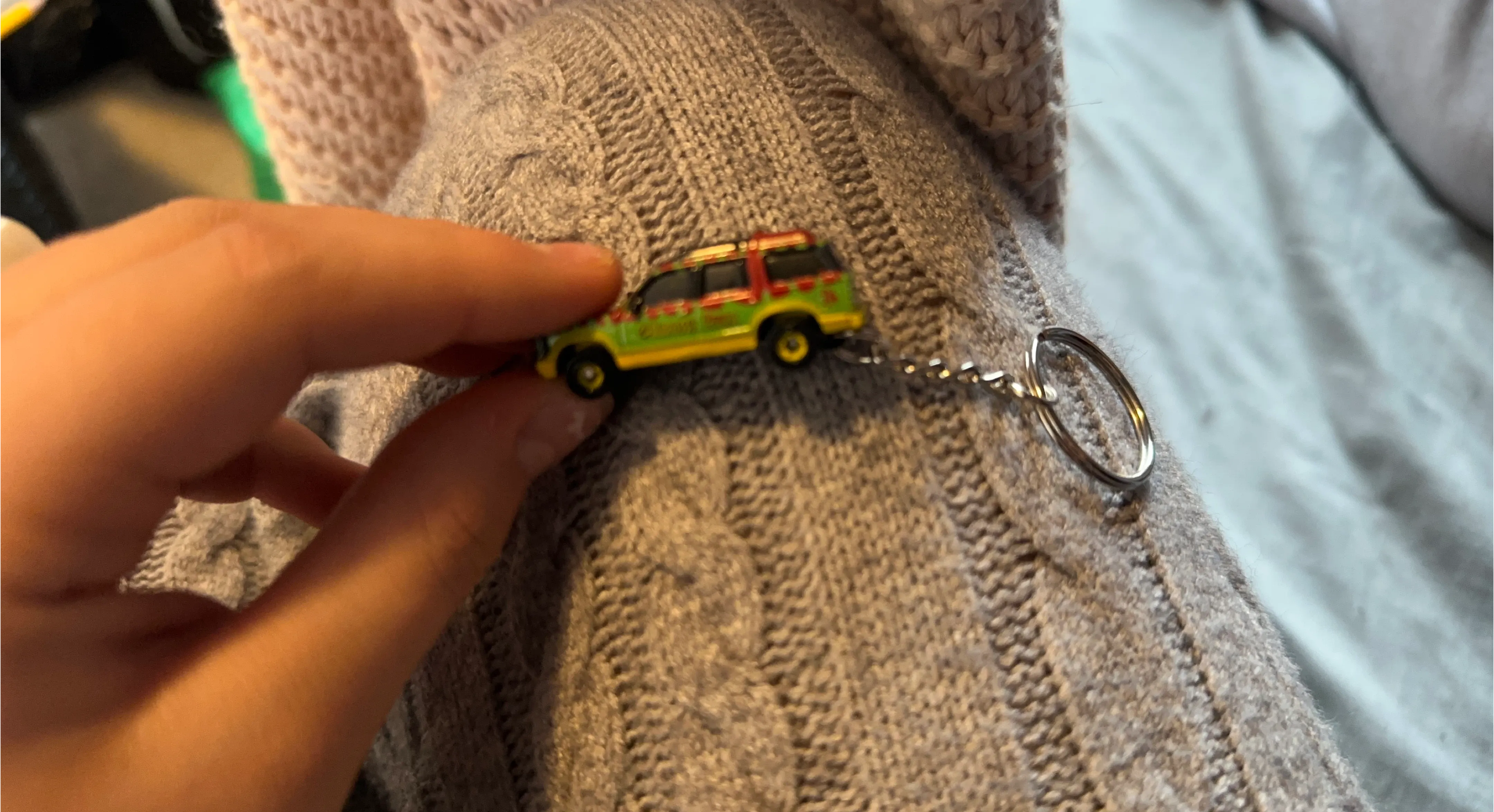 This is a mini Jurassic Park Explorer vehicle keychain. It's green and yellow with red accents. A fun accessory for any Jurassic Park fan!