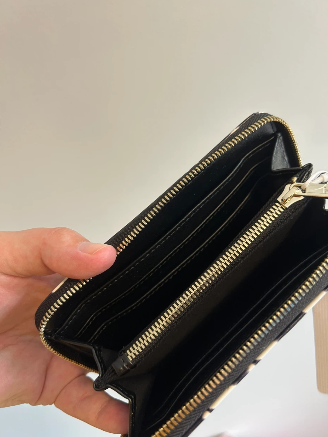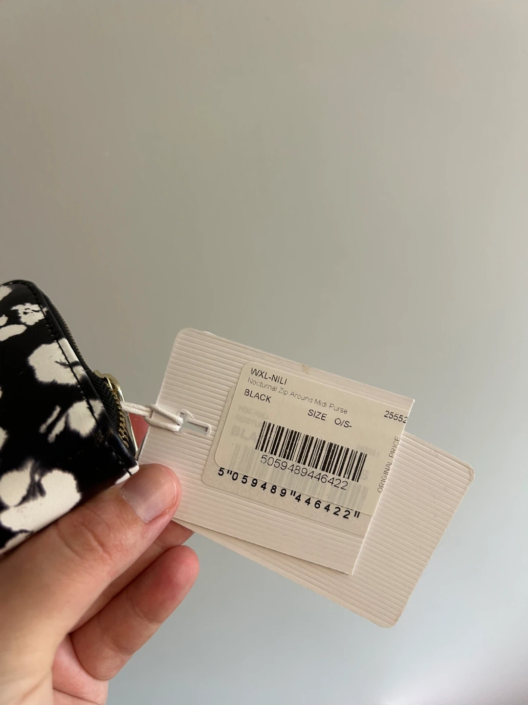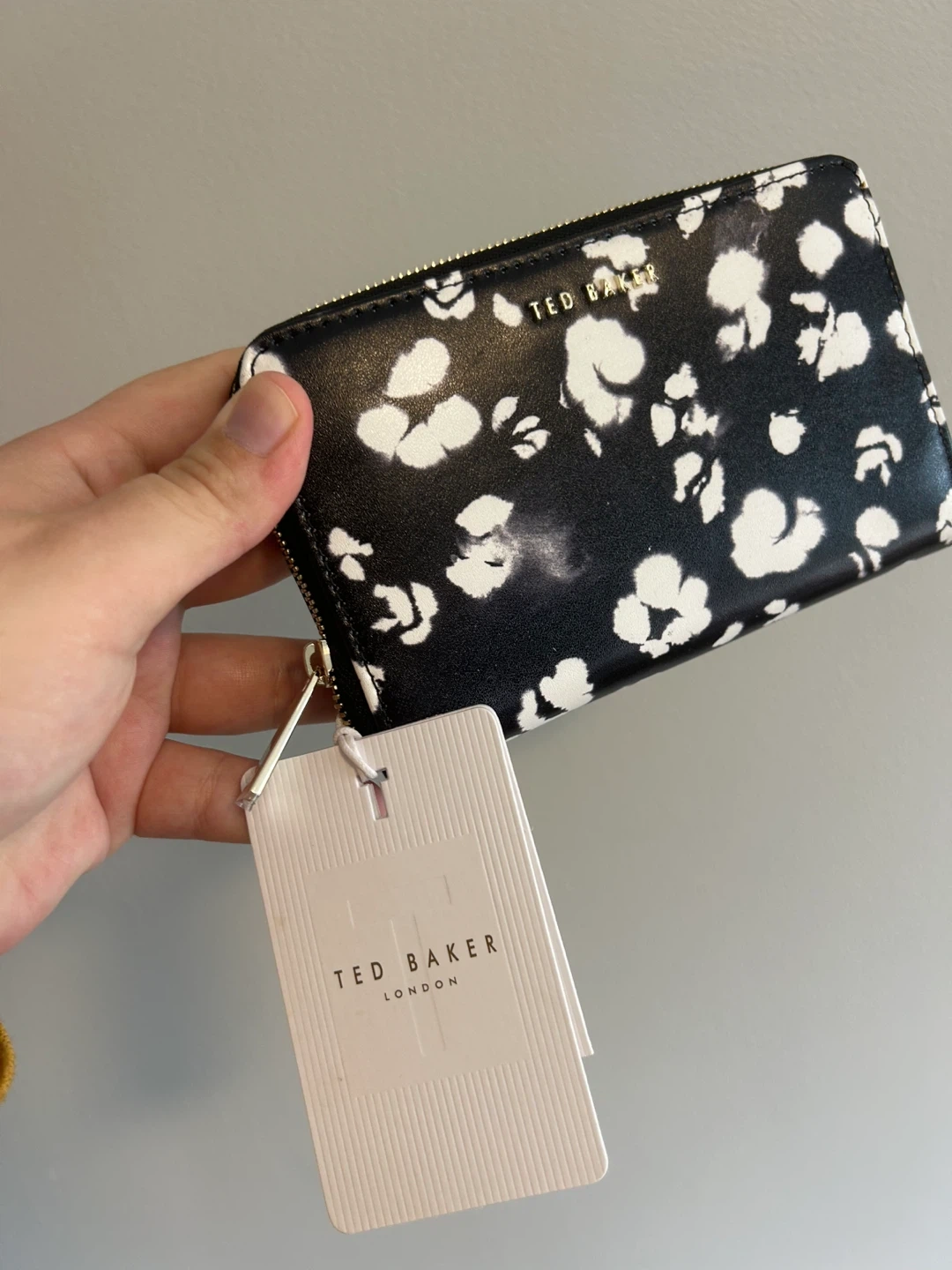 Ted baker brand. Mini zip wallet. Black & white cheers like print; leather material. Brand new with tags