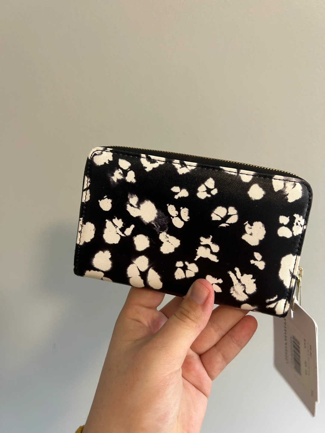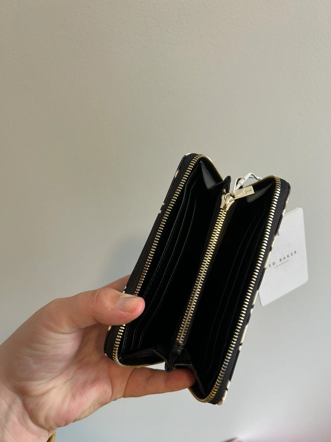 Ted baker brand. Mini zip wallet. Black & white cheers like print; leather material. Brand new with tags