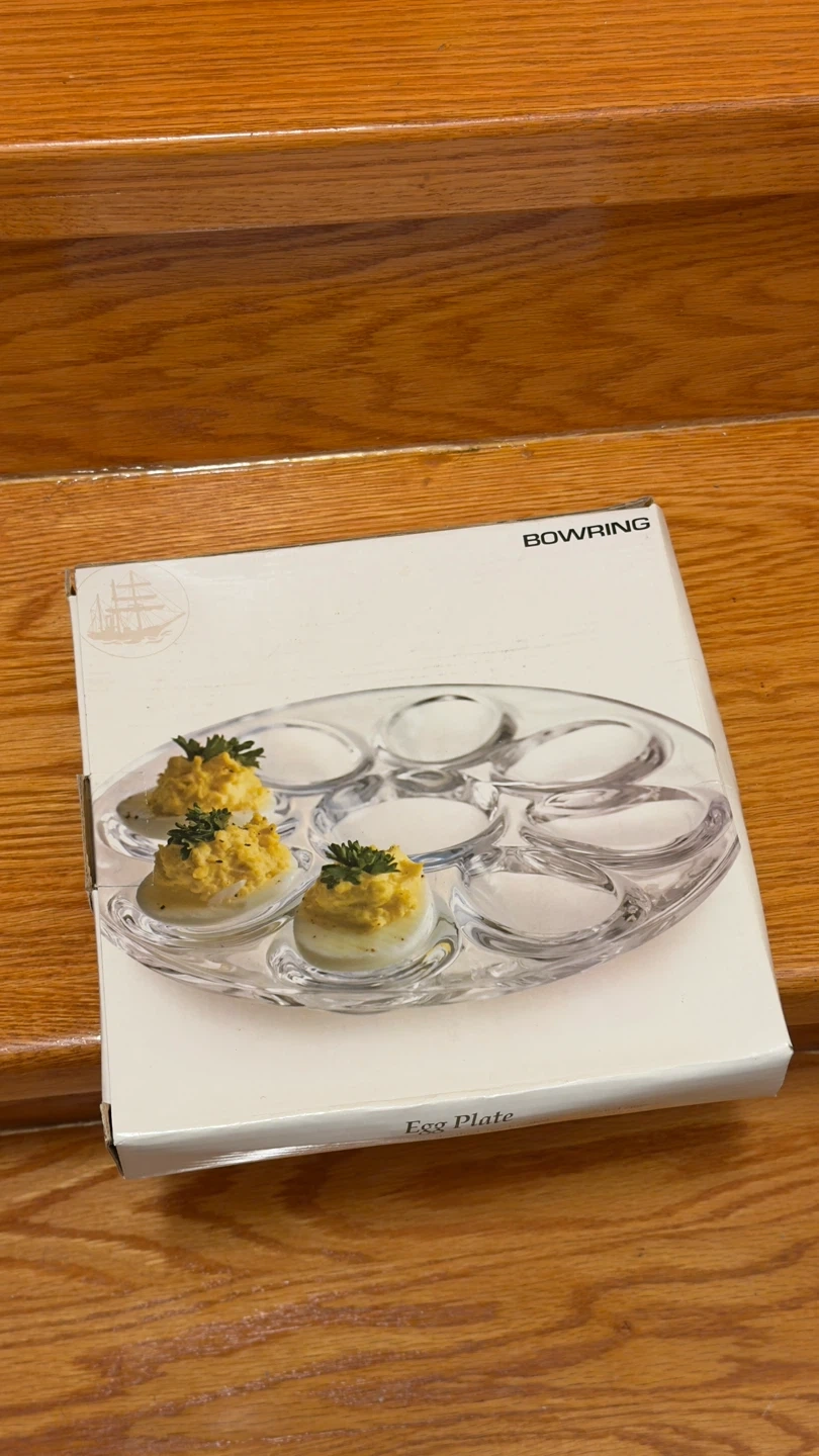 This is an egg plate from Bowring. It holds 8 half or whole eggs and has a central area for sauce. It's perfect for serving devilled, hard-boiled, or decorated eggs!