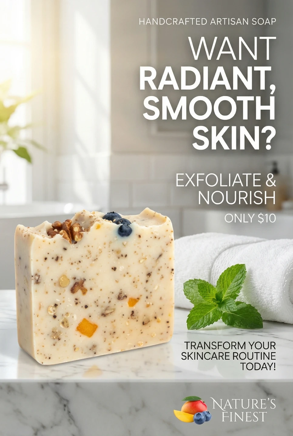 This handcrafted artisan soap is made to exfoliate and nourish your skin. It's infused with oats, walnuts, blueberries, and apricot pieces. It's great for transforming your skincare routine!
