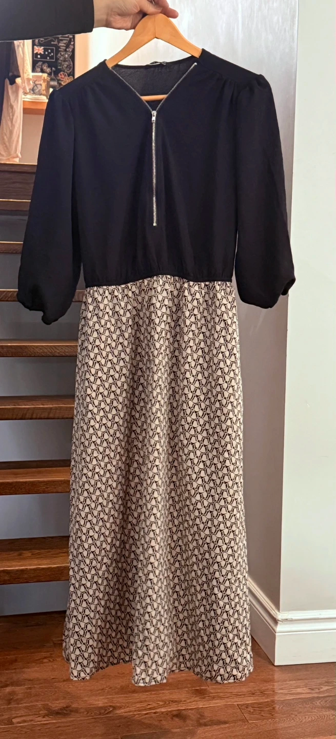 This midi dress features a black bodice with a silver zipper closure. The skirt has a repeating geometric pattern in cream and black. It has three-quarter length sleeves.
