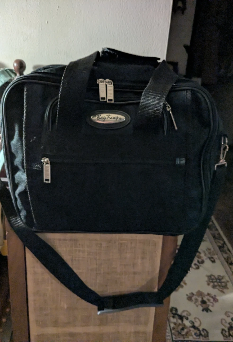 Laptop bag. Very roomy, It's made of fabric and has a shoulder strap. Multiple zippered, 5 compartments are present. Has a divided Loop to fit over suitcase handles.
