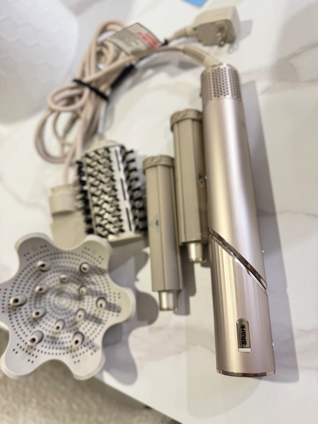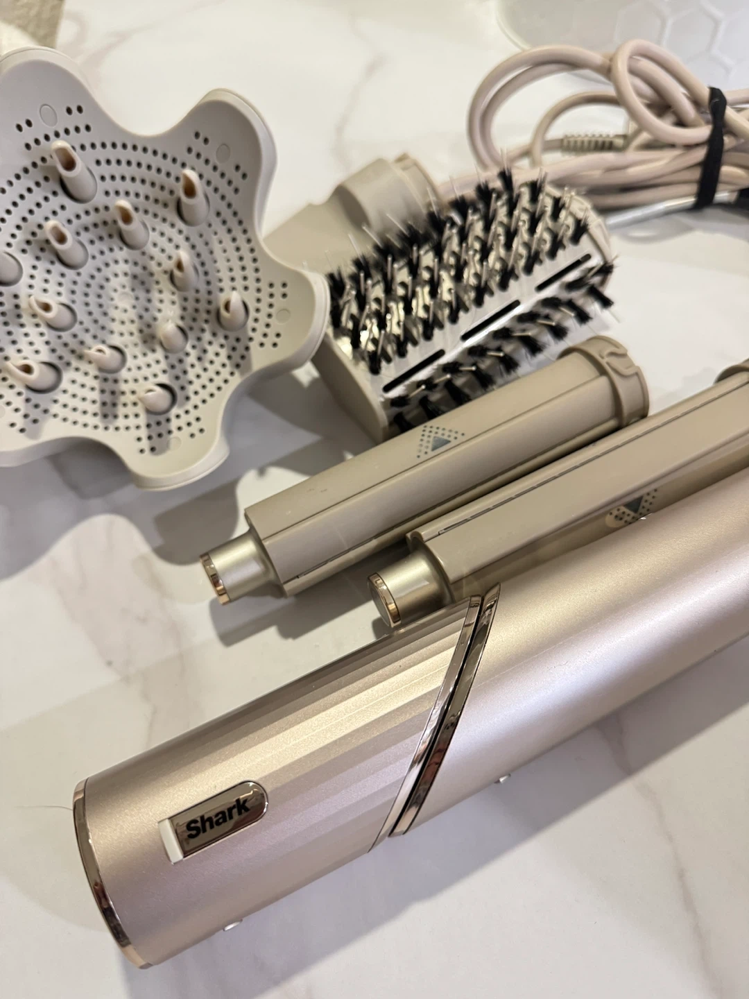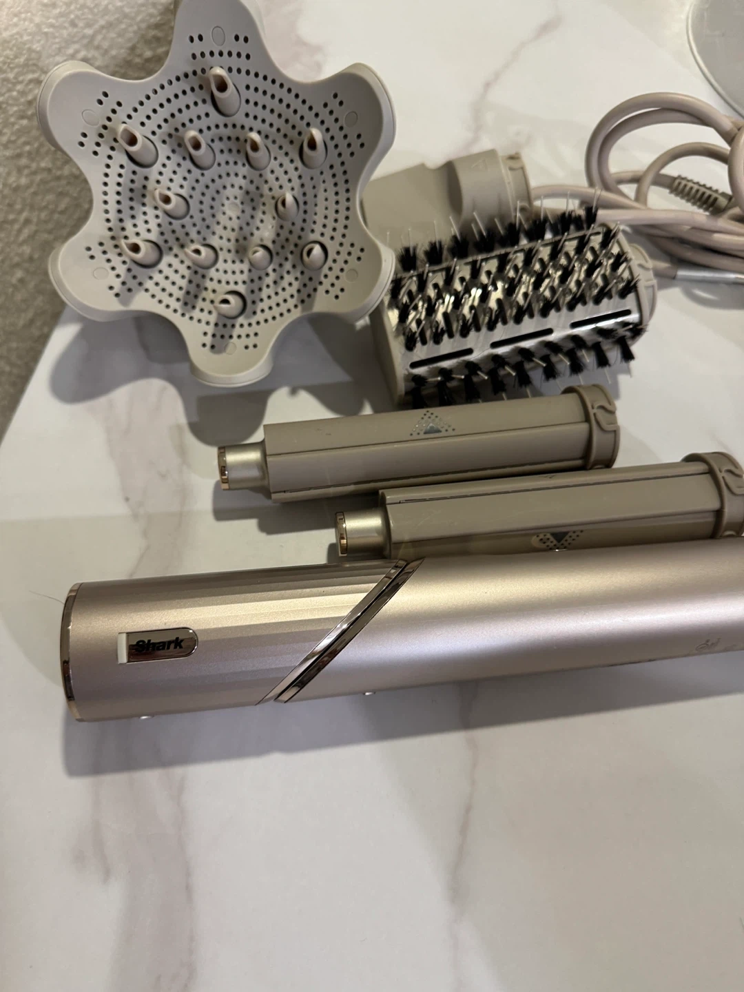 This Shark hair styler comes with a diffuser and two barrel attachments. It's designed for versatile styling options.