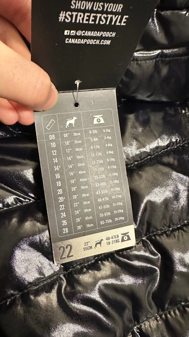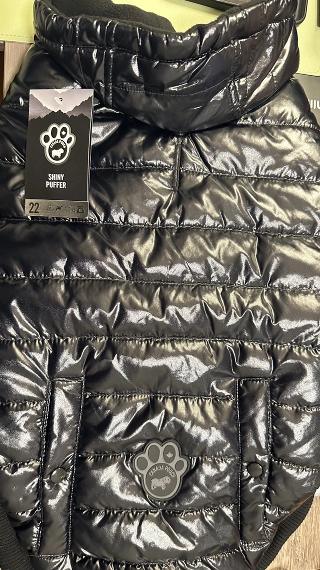 Keep your furry friend cozy and stylish with this brand new Canada Pooch Shiny Puffer Vest, size 22. This black puffer vest is designed to keep your dog warm and dry during chilly walks. * Size: 22 (fits dogs 46-52lbs, 16-21kg, 55cm) * Colour: Black * Condition: New with tags If the ad is still up, it's still available! Grab this fashionable and functional vest before it's gone! Cash accepted.