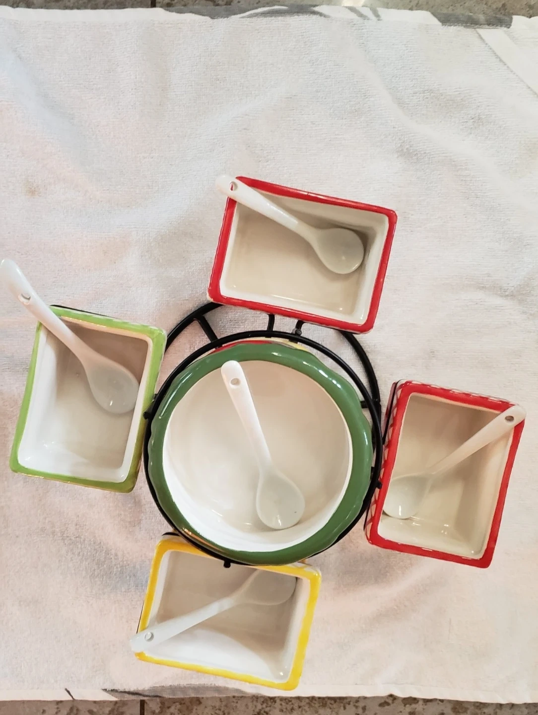Pier 1 Imports condiment server set, including the bowl, four small square dishes, spoons, and metal stand. The dishes are mustard,relish, ketchup and mayonnaise. Do not have original box