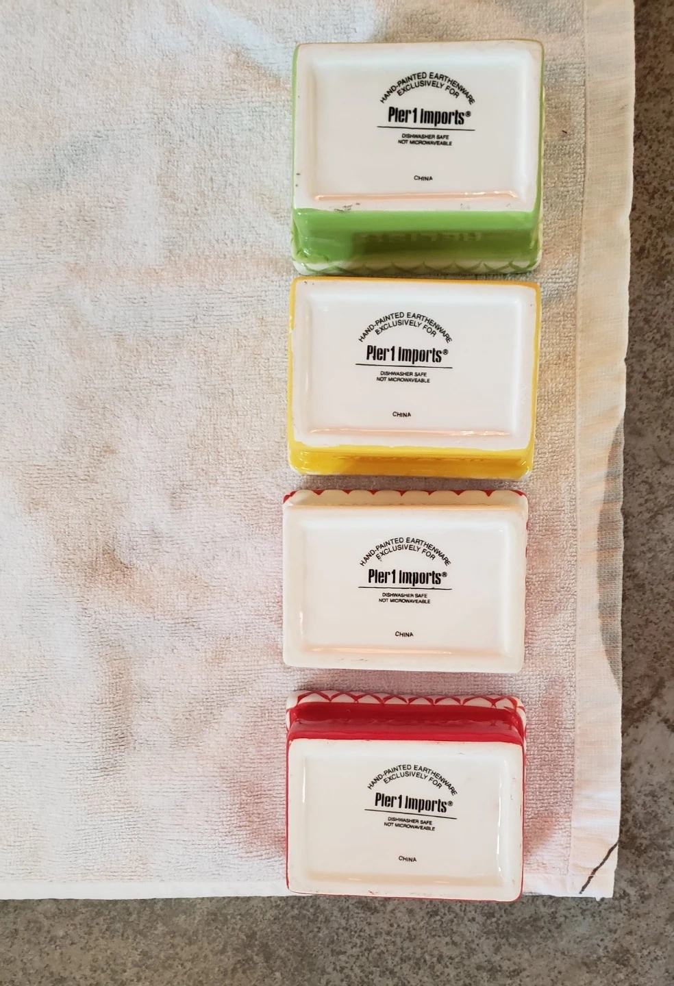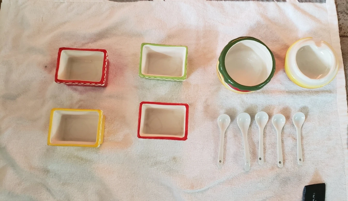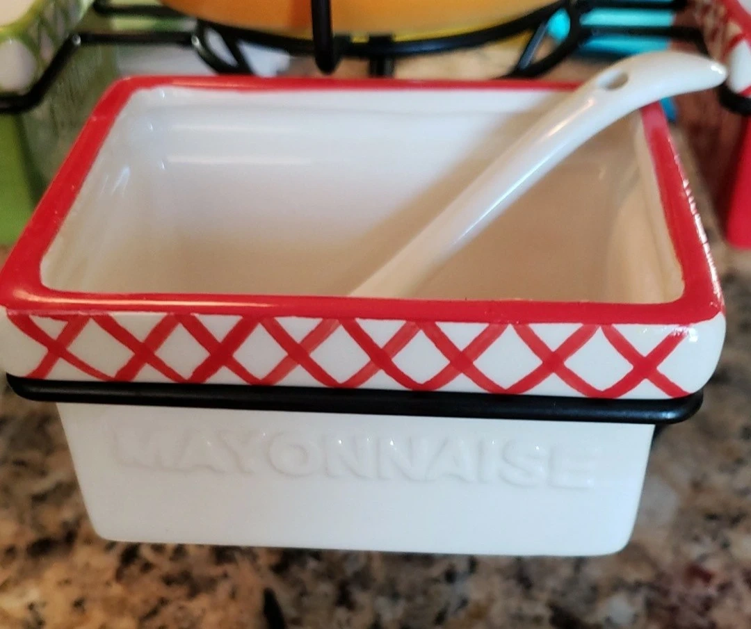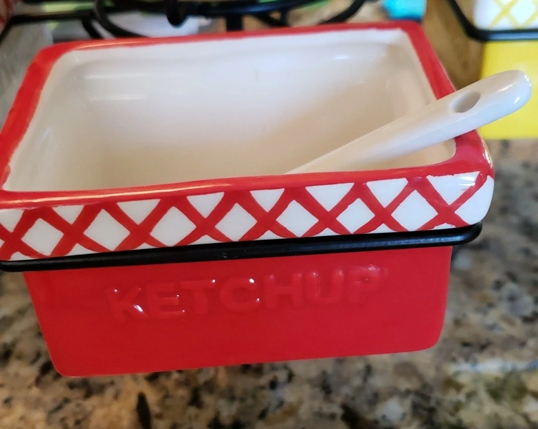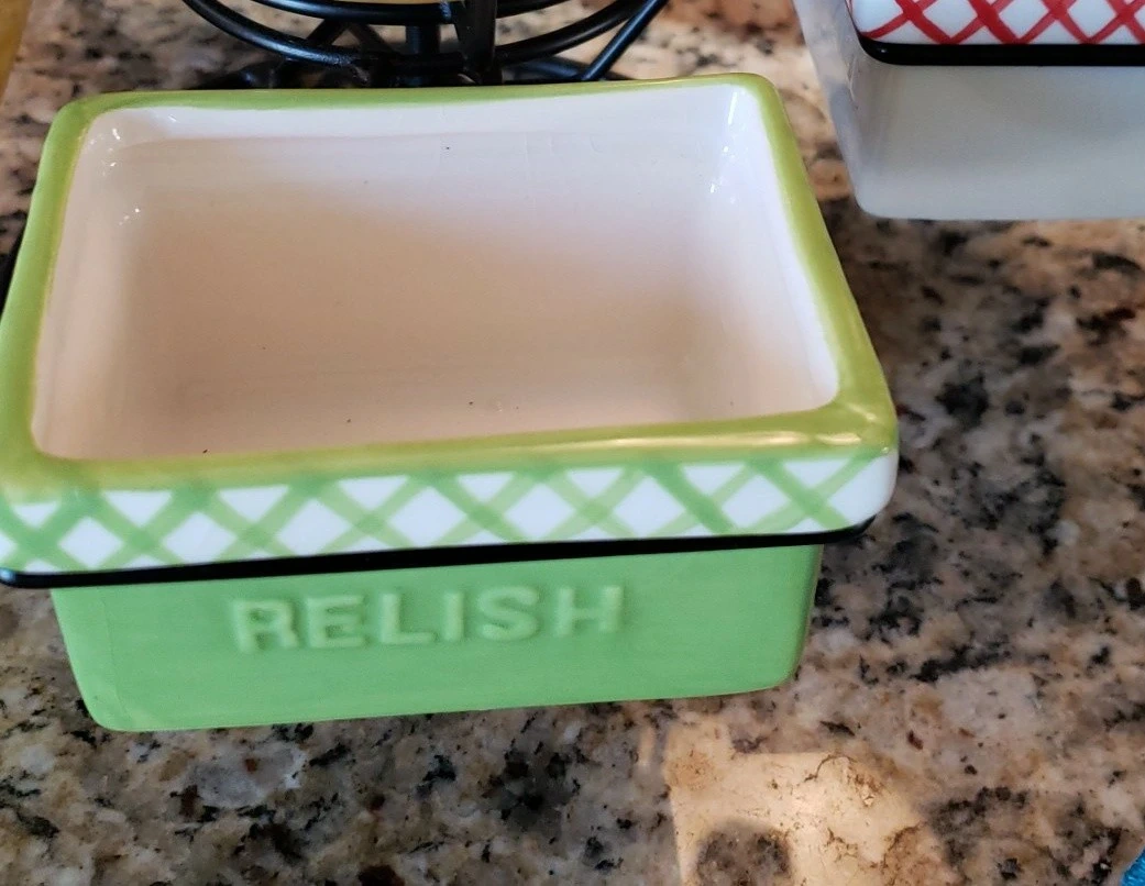 Pier 1 Imports condiment server set, including the bowl, four small square dishes, spoons, and metal stand. The dishes are mustard,relish, ketchup and mayonnaise. Do not have original box