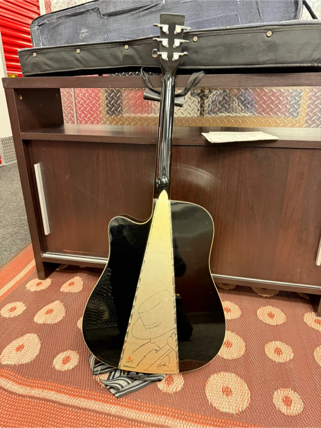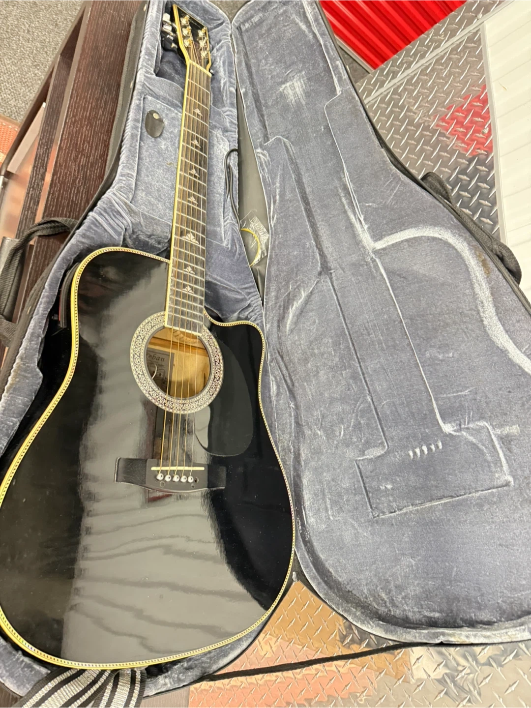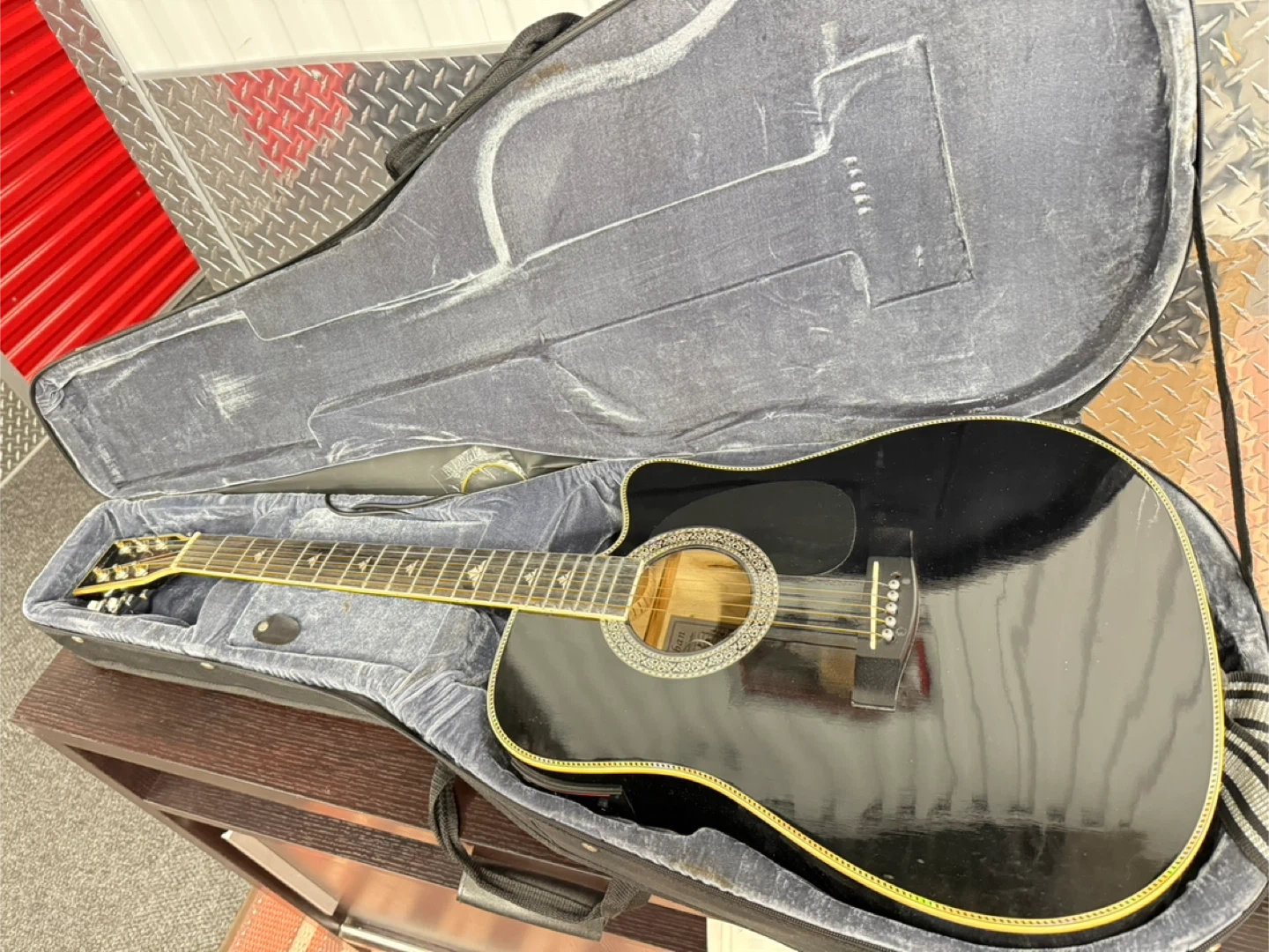 Black Takamine acoustic-electric guitar. Includes a hard case for protection and transport. The guitar features a cutaway body and decorative inlay on the back.