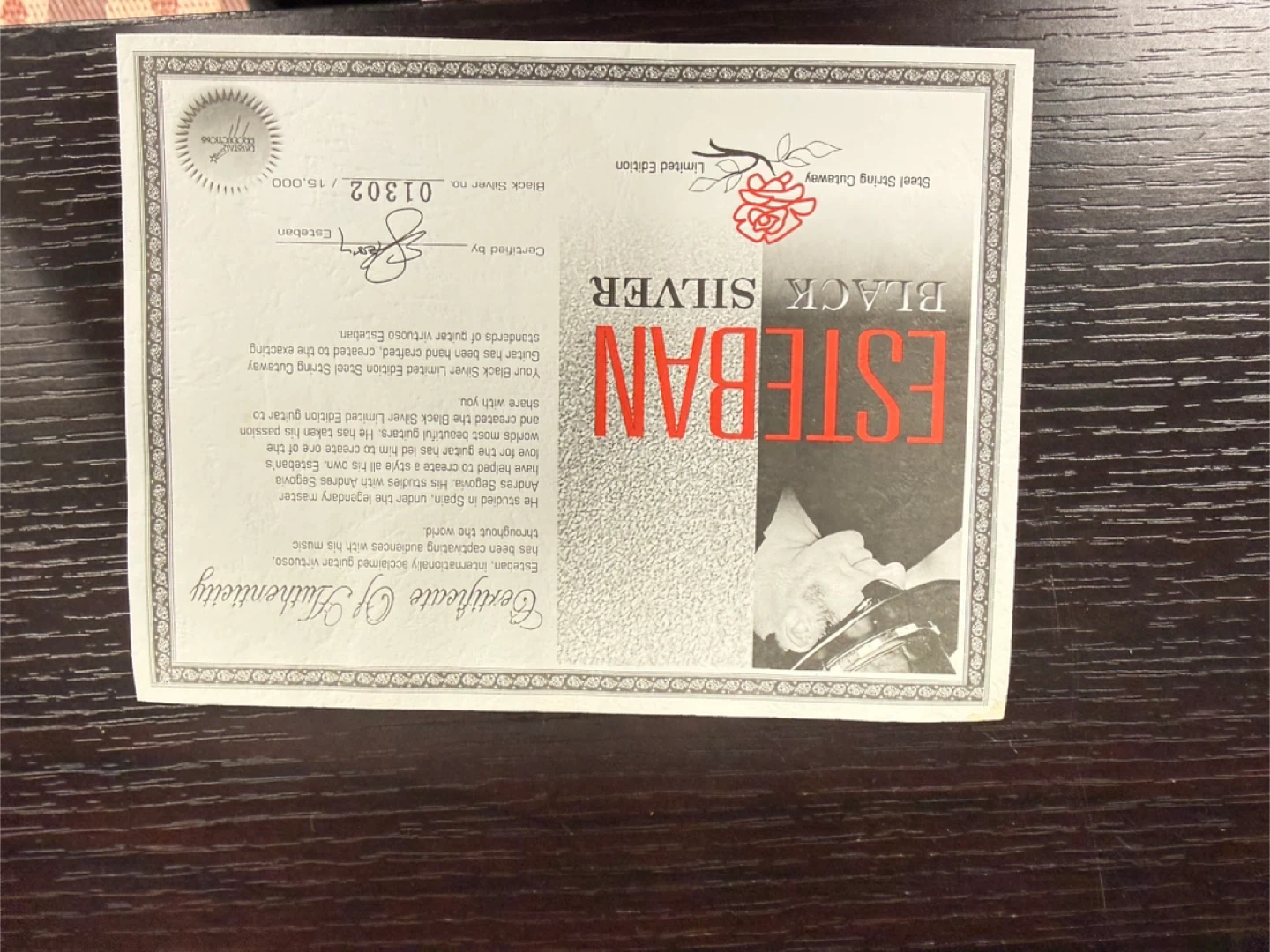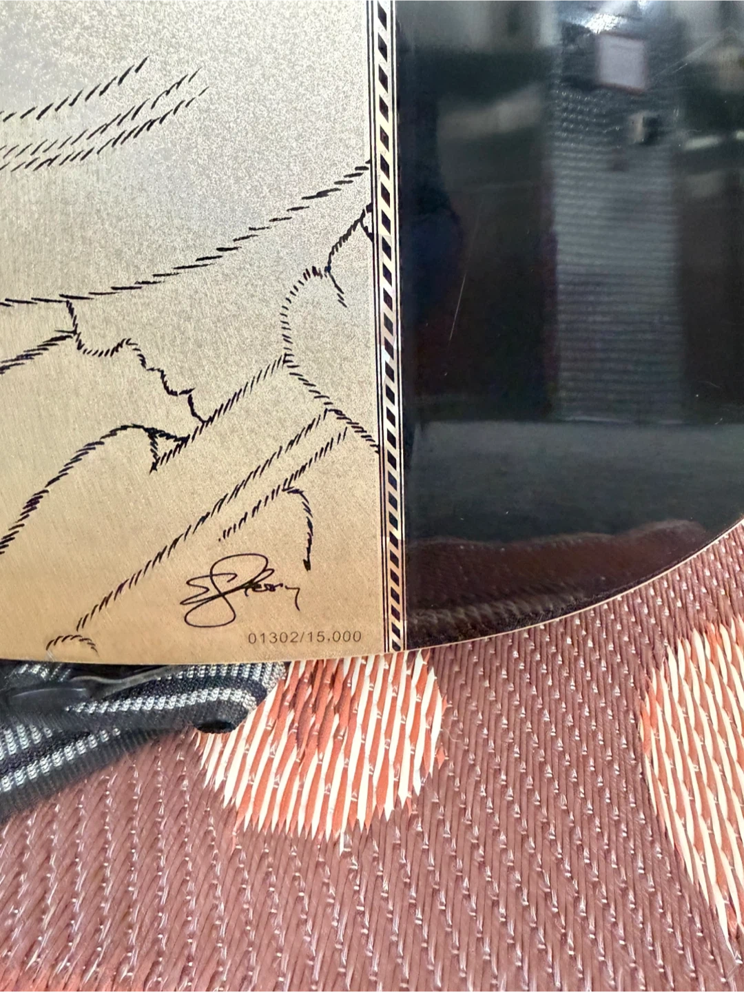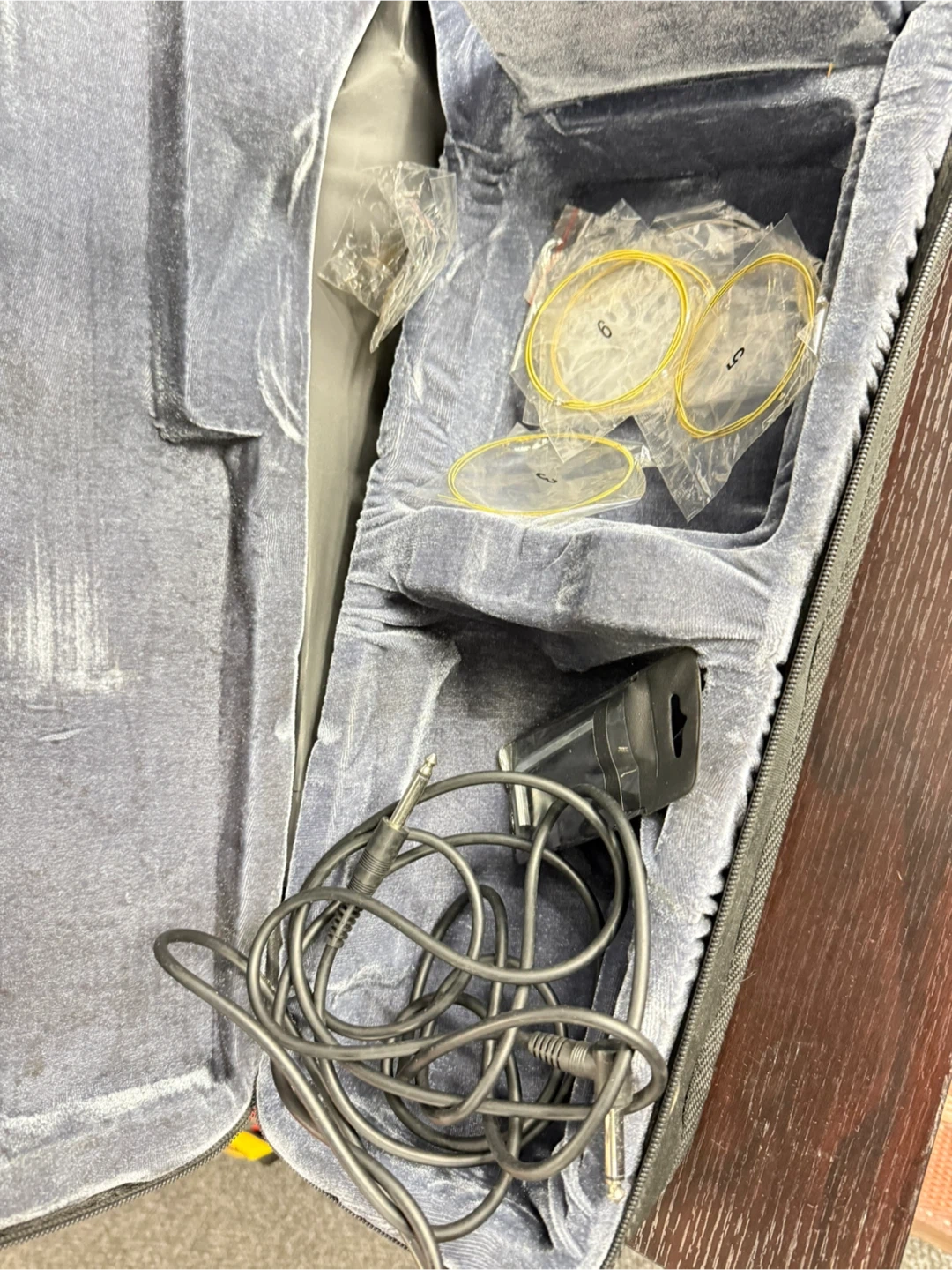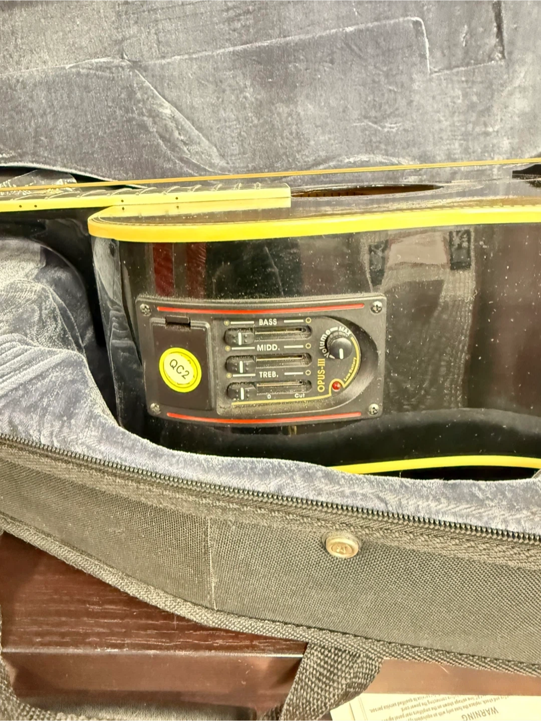 Black Takamine acoustic-electric guitar. Includes a hard case for protection and transport. The guitar features a cutaway body and decorative inlay on the back.