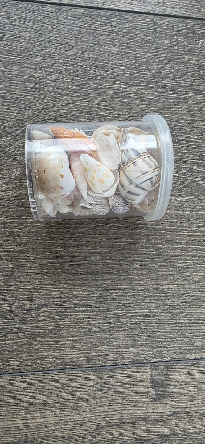 A collection of various seashells gathered in a clear plastic container. Assorted sizes and types are included, perfect for crafting or home decor. Makes a lovely accent piece for any room!