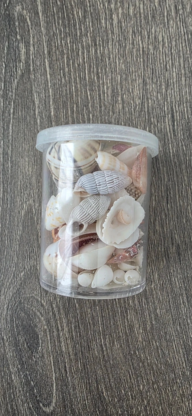 A collection of various seashells gathered in a clear plastic container. Assorted sizes and types are included, perfect for crafting or home decor. Makes a lovely accent piece for any room!