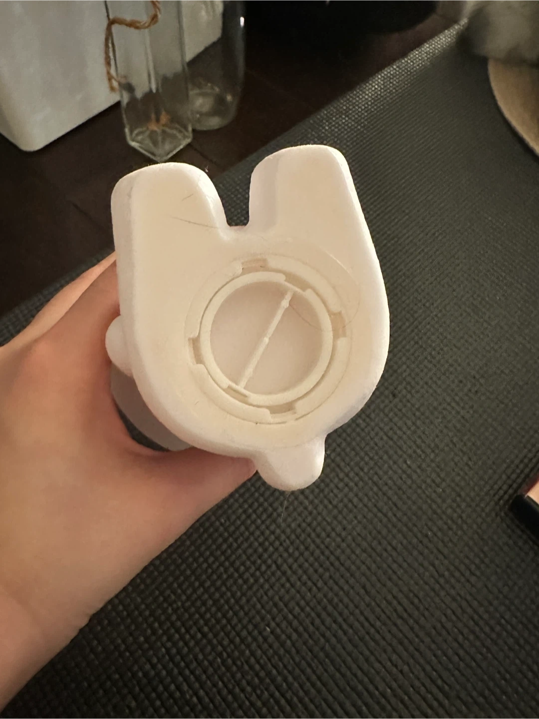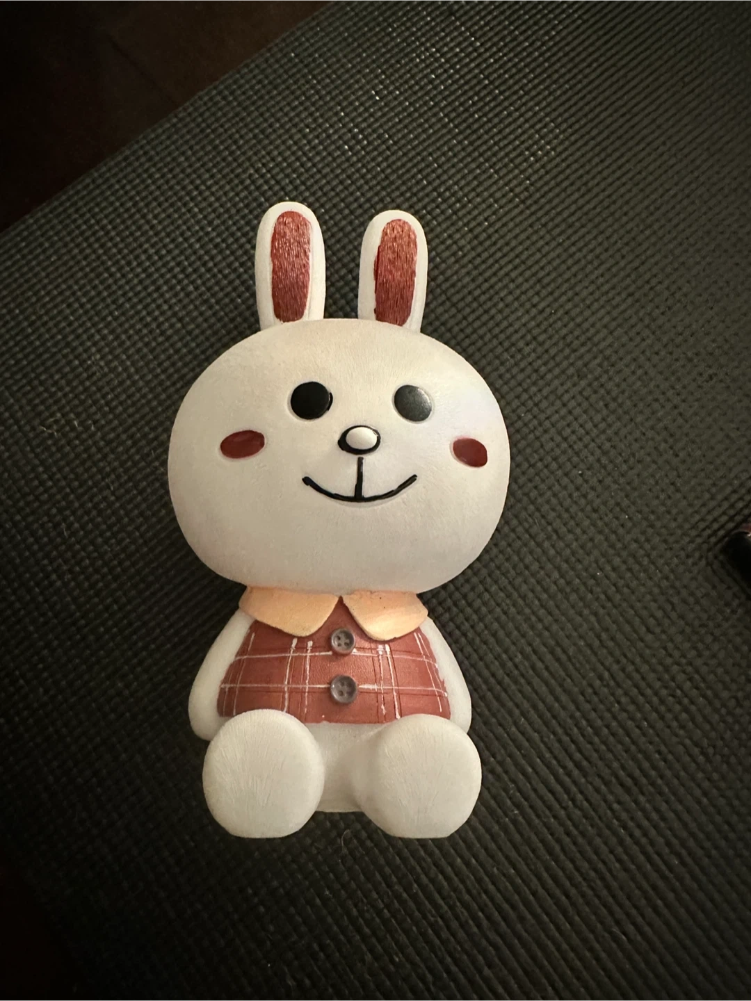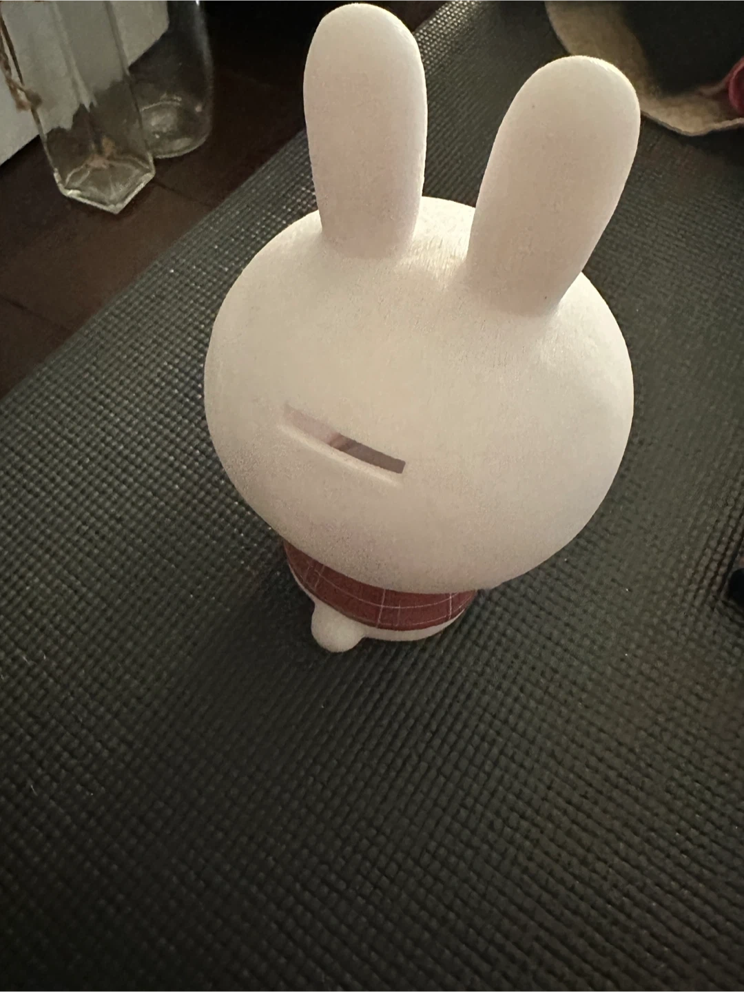 White piggy bank shaped like a bunny wearing a plaid vest. It's a cute way to save change! The slot is on top and there's a stopper on the bottom.