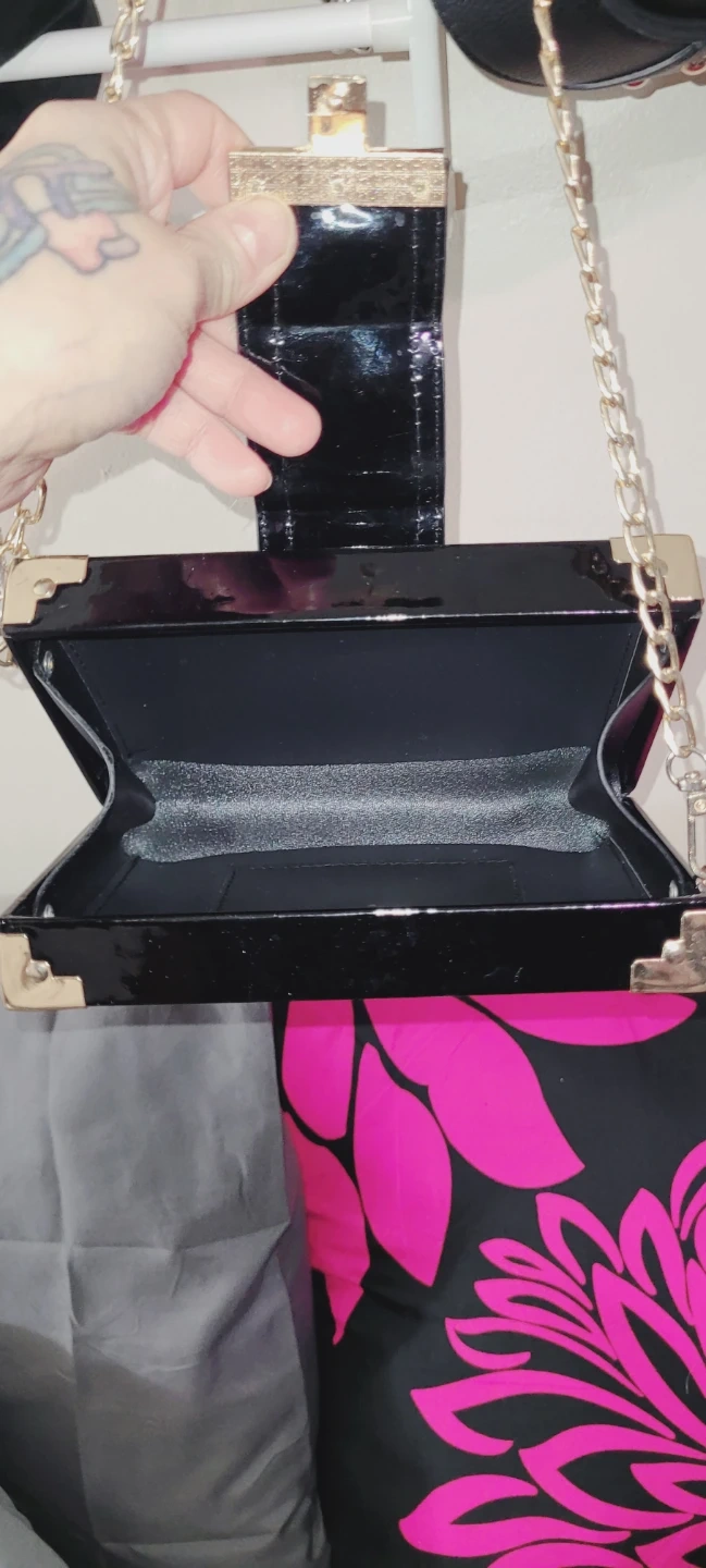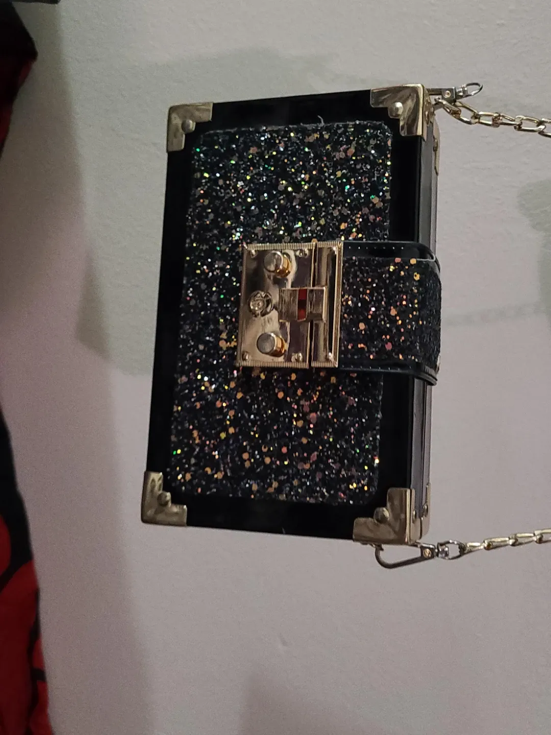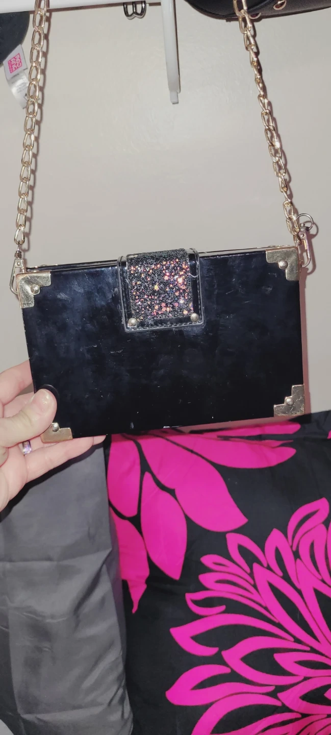 Sparkly black clutch purse designed like a mini trunk. It features a glitter panel on the front and a secure clasp closure. Includes a detachable gold-tone chain strap.