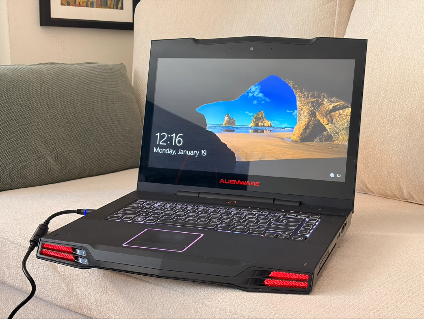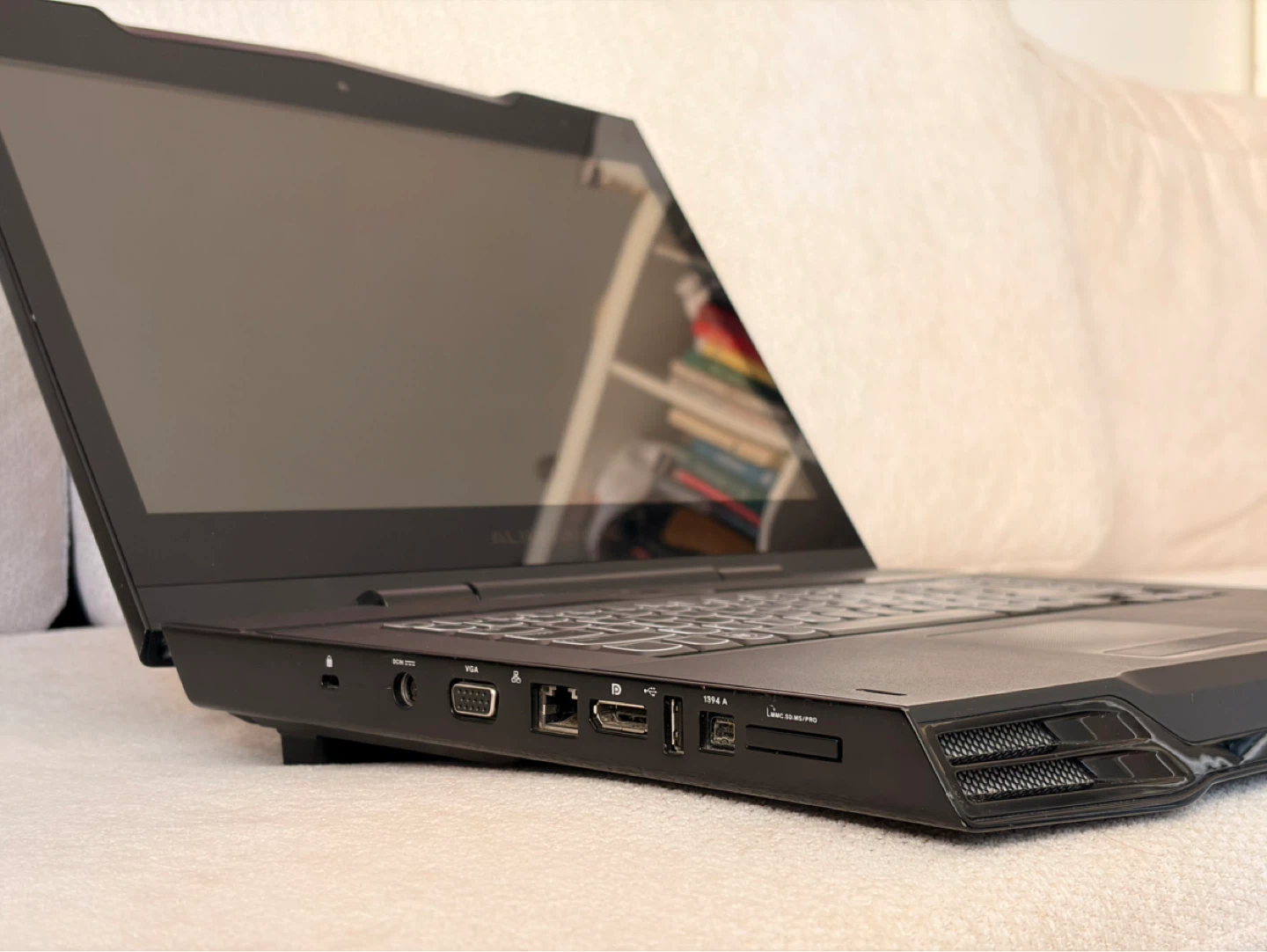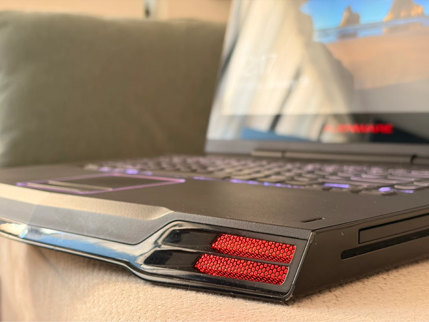 This is a large Alienware gaming laptop. It features a backlit keyboard and several ports for connectivity. The laptop has a distinctive aggressive design with red accents. Perfect for office tasks, gaming, remote work, school, and media. • Intel Core i7 (up to 4.0Ghz, 8 Cores) • 6GB RAM • 17.3” FullHD LED • 500GB Storage • AMD Radeon Graphics 5800, 2GB Battery like 2-3 hours Charger included