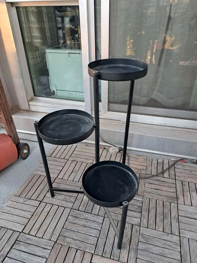 This is a black, metal Ikea plant stand with three tiers, perfect for displaying your favourite plants! It's in good condition and ready to bring some greenery into your space. It's a charming addition to any room, and will add some flair to your plants! If the ad is up, it's available! I am asking $40.