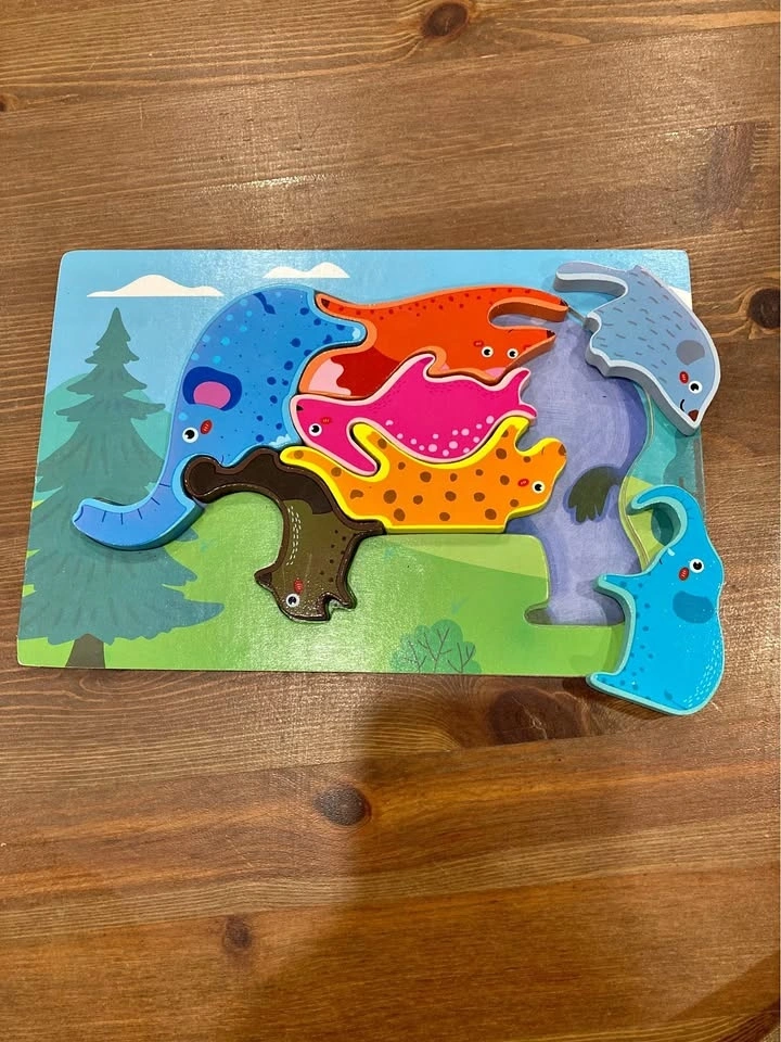 Colorful wooden animal puzzle with chunky pieces designed for toddlers and preschoolers. Great for developing fine motor skills, problem-solving, and animal recognition.