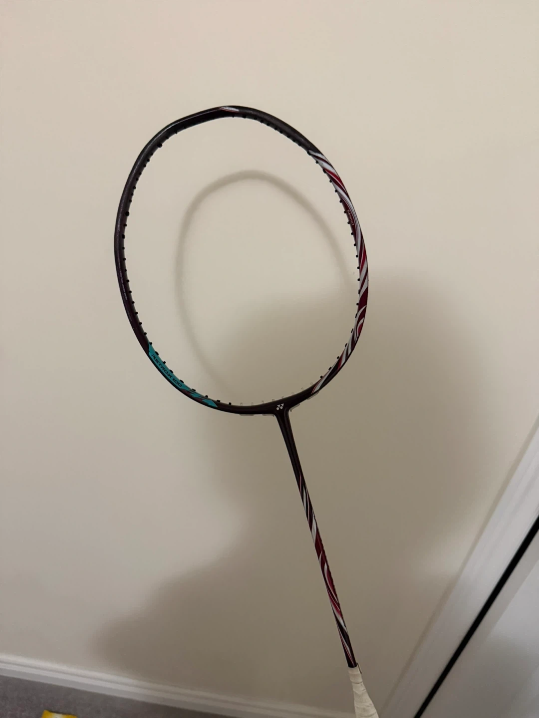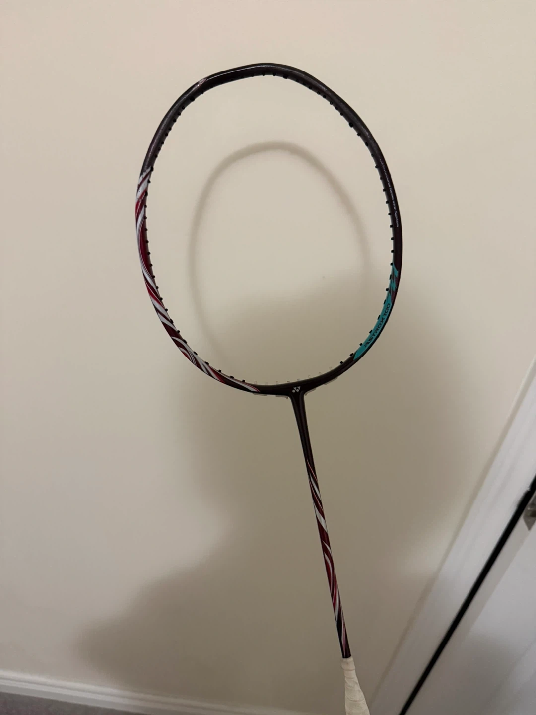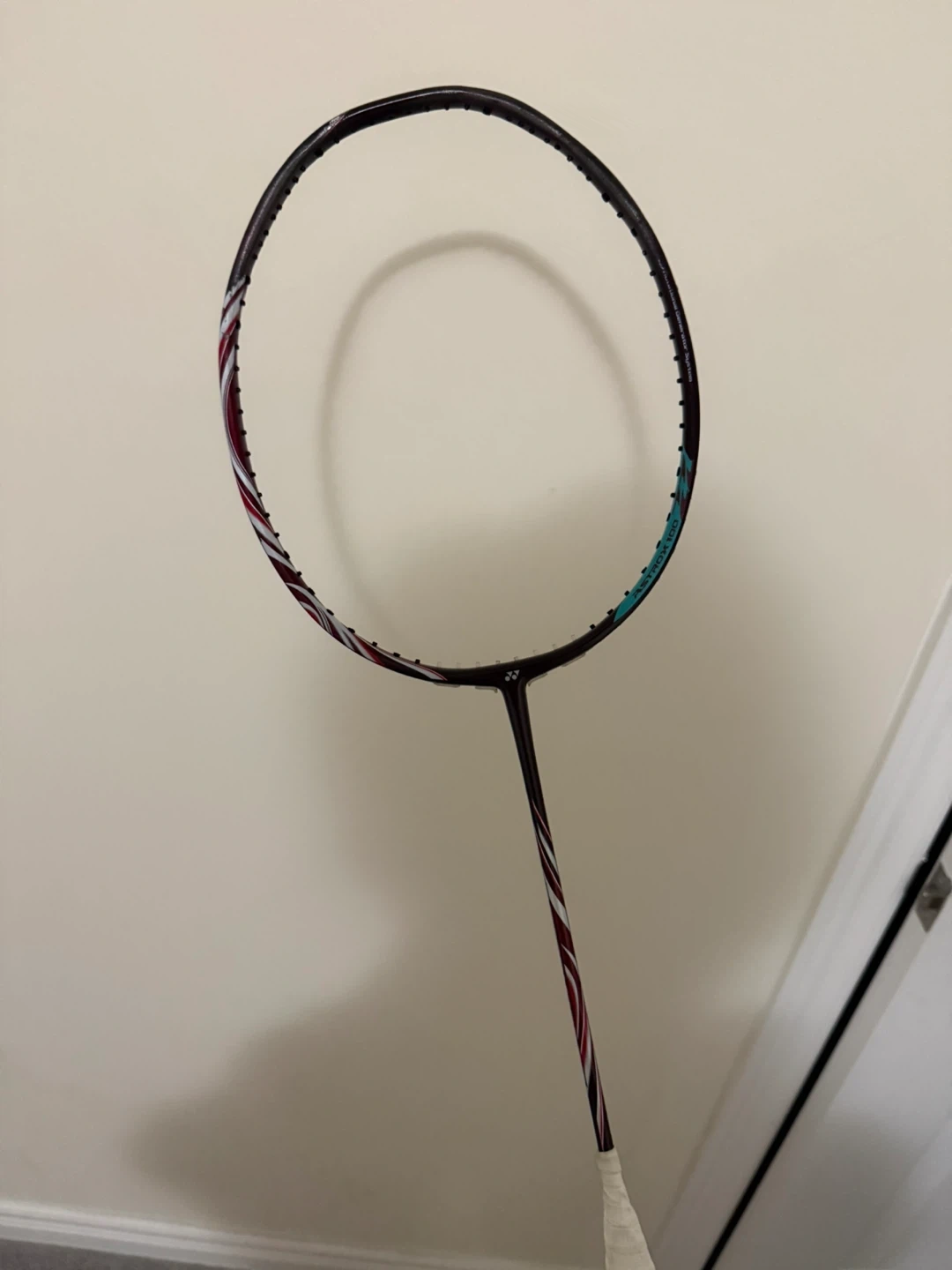 This is a Yonex AX100ZZ 4UG5 CH code. It features a dark frame with red, white, and teal accents on the shaft and head. The grip is wrapped in white tape. Ready for your next match!