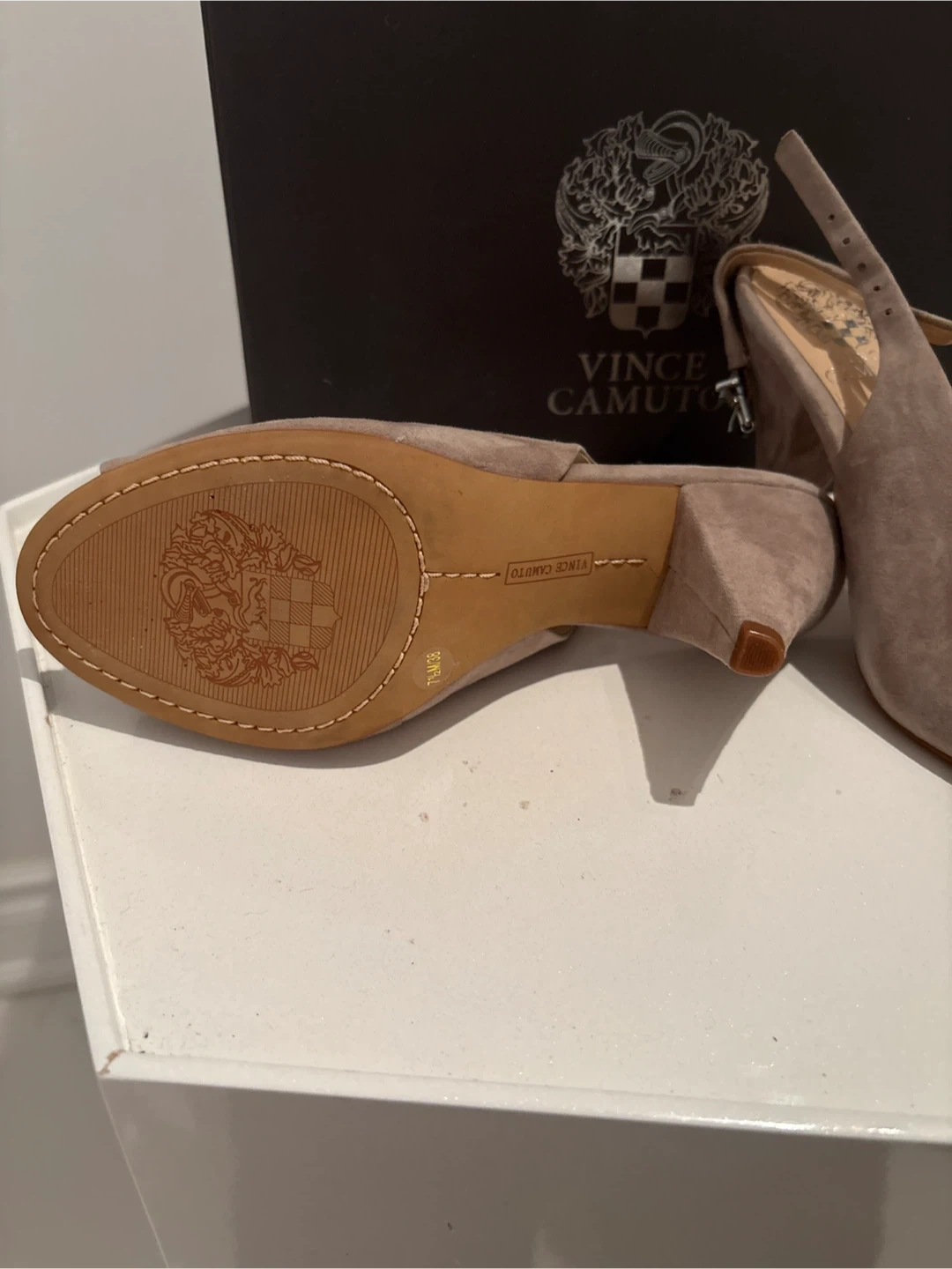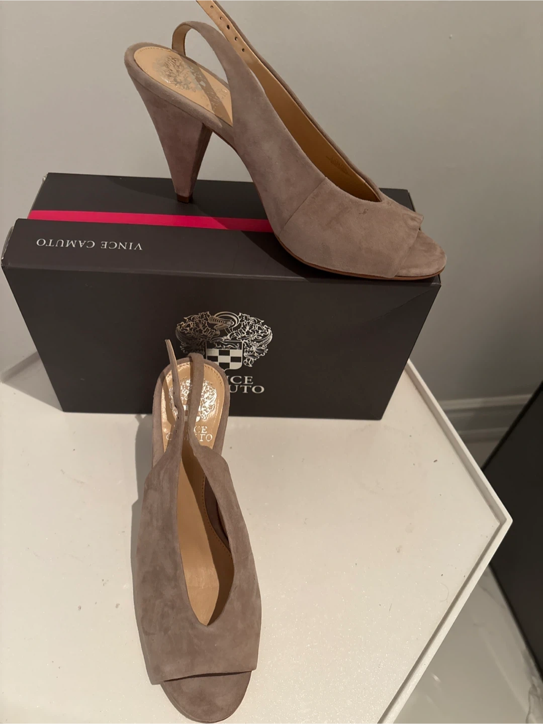 Vince Camuto slingback heels in a taupe suede. These peep-toe pumps have an adjustable ankle strap and a comfortable block heel. They're made of suede material and come with the original box. Size 7.5M.