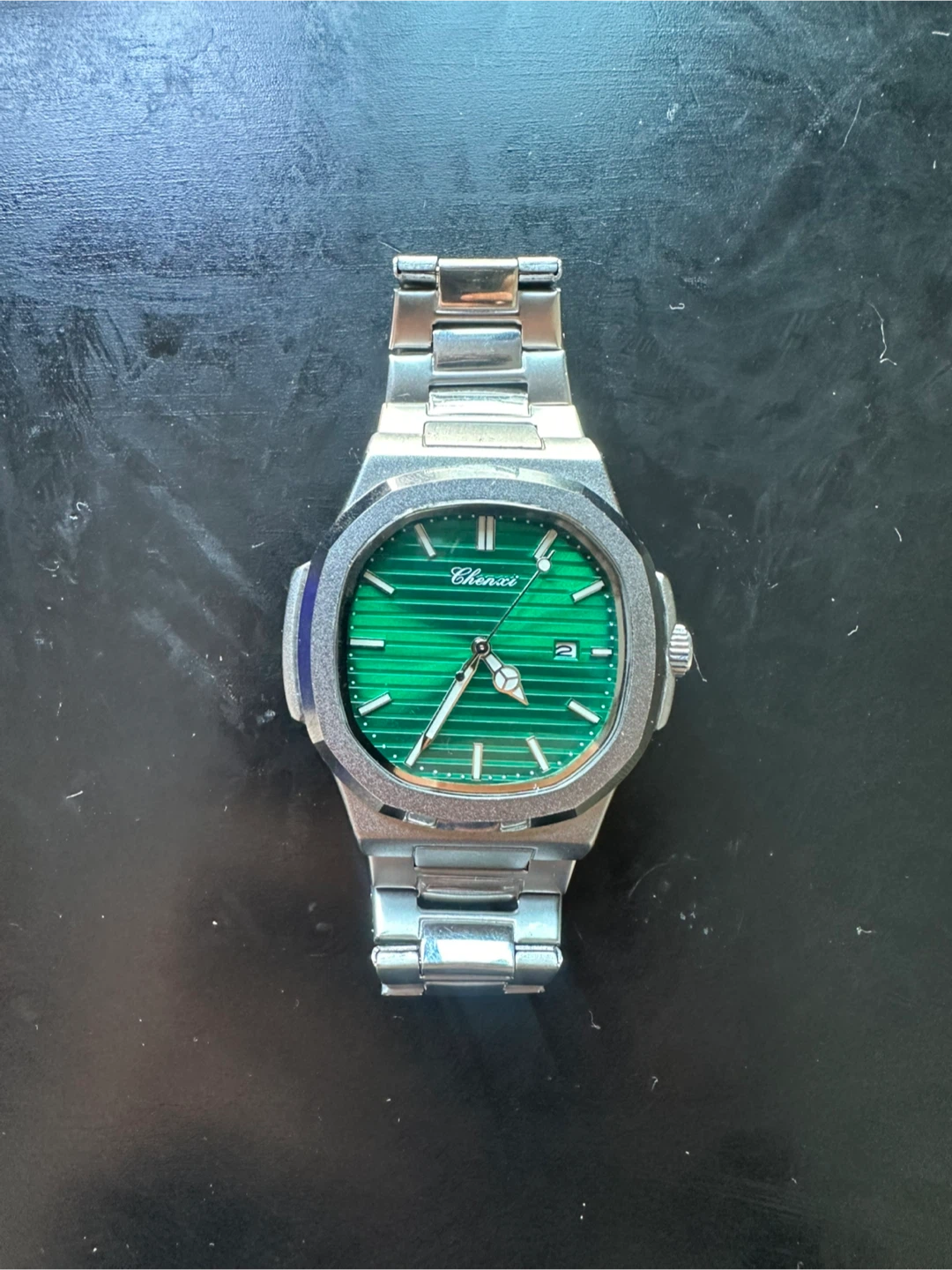 This Chenxi watch has a stylish stainless steel band and a vibrant green dial. It's designed with a date window for added functionality. Perfect for everyday wear or dressing up!