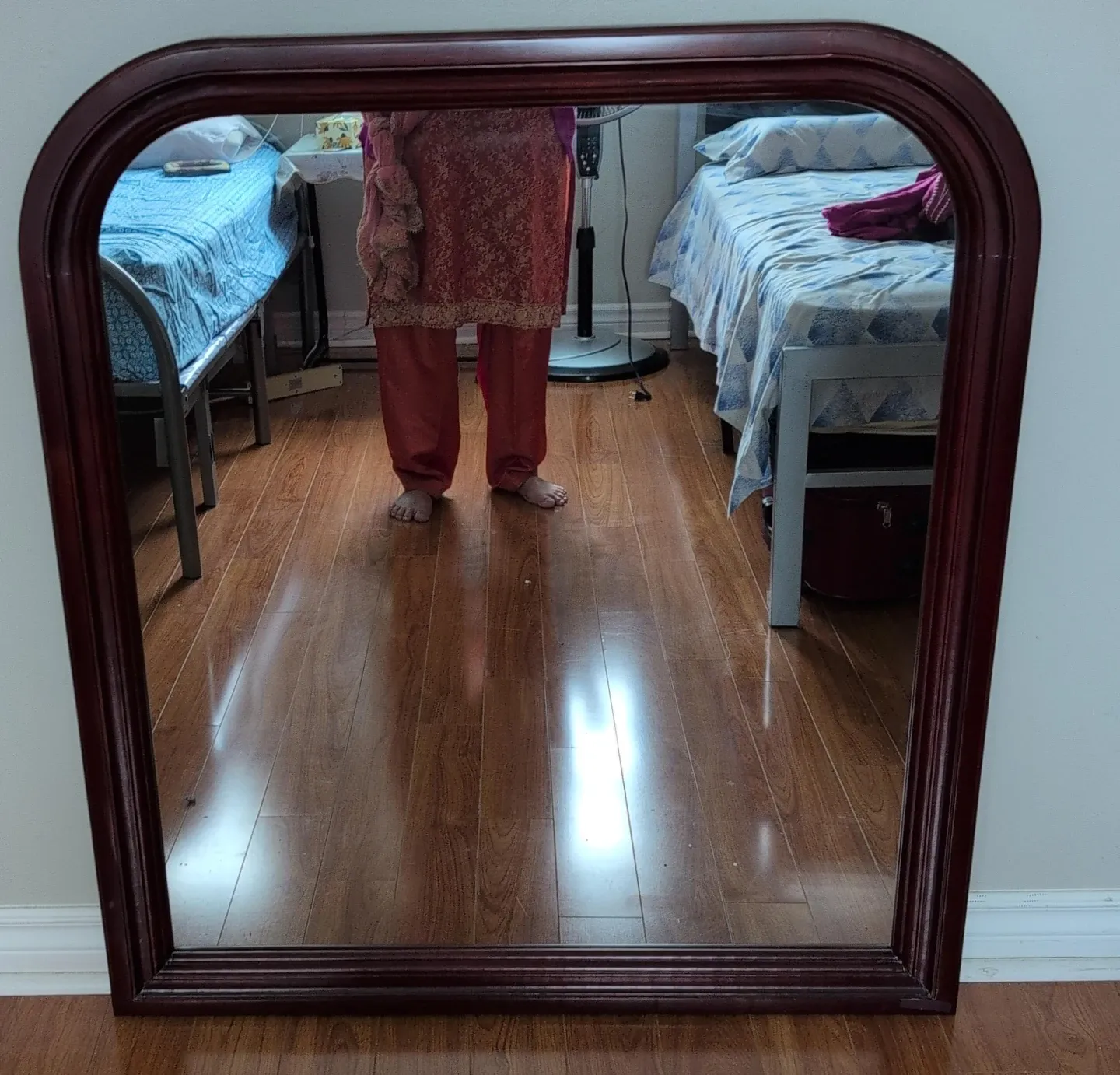 A nice decorative mirror with a wooden frame. Its arch top design adds a touch of elegance. This mirror is perfect for entryways or bedrooms.
