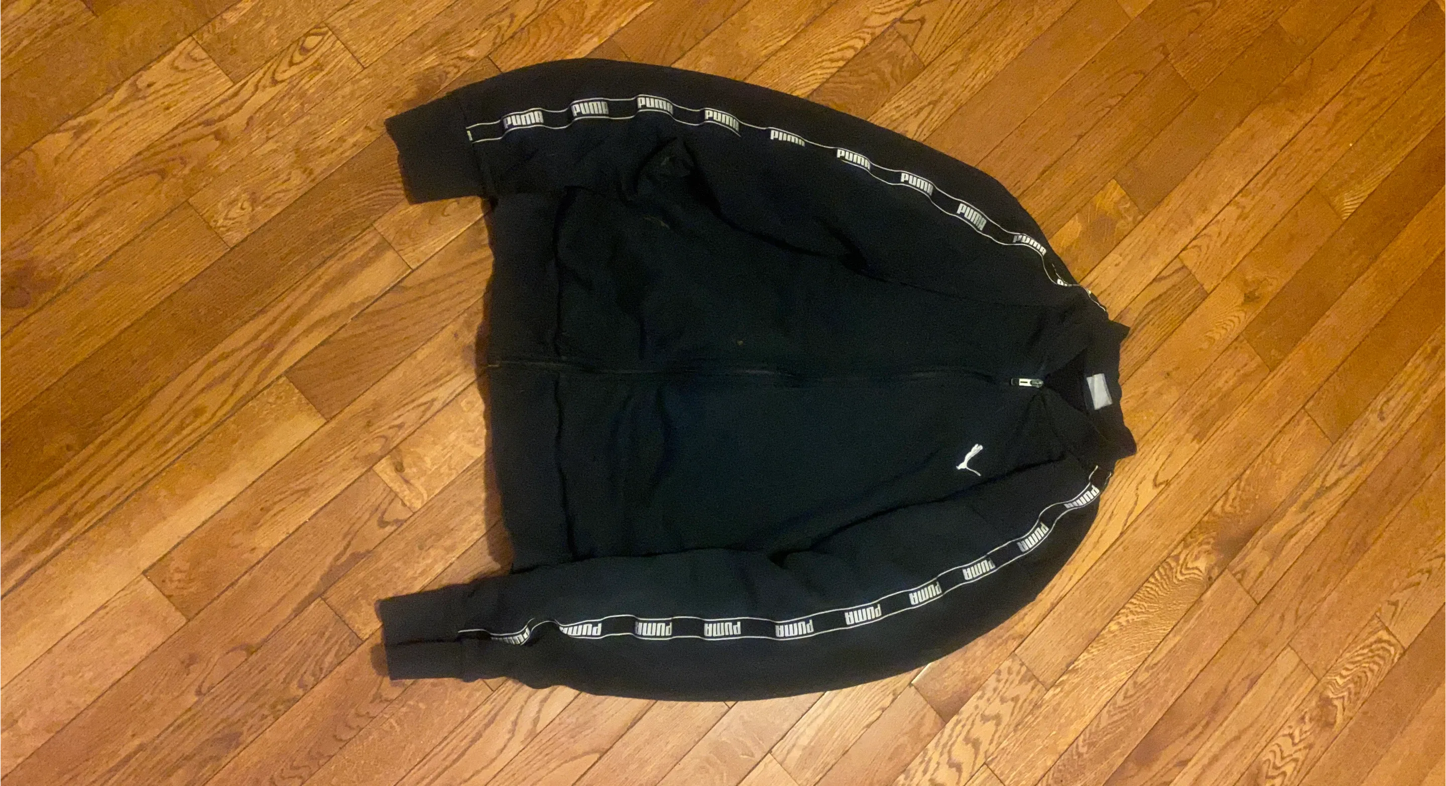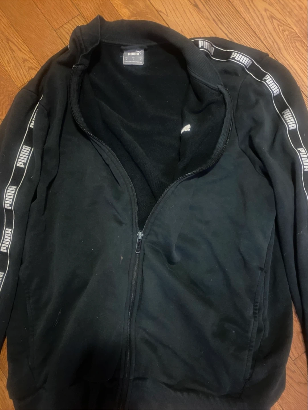 Selling a XL black PUMA track jacket. It features the PUMA logo on the front and the brand name repeated along the sleeves. Great for casual wear or workouts!