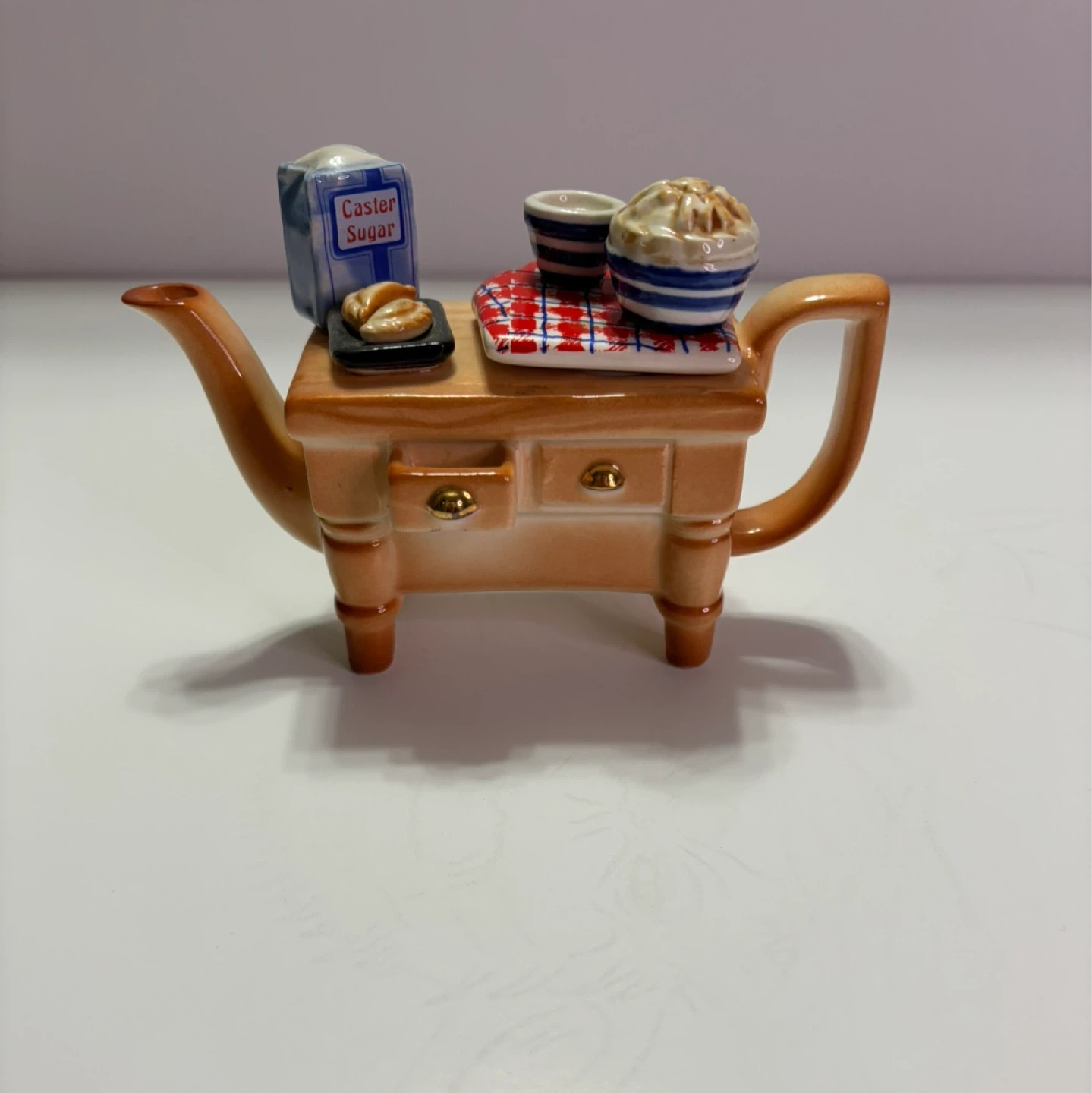This is a charming vintage ceramic teapot designed as a miniature table set. It includes a caster sugar container, a small bowl, and a dish with pastries, all arranged on a table-shaped teapot. It's a unique and whimsical piece for collectors or anyone who appreciates vintage decor.