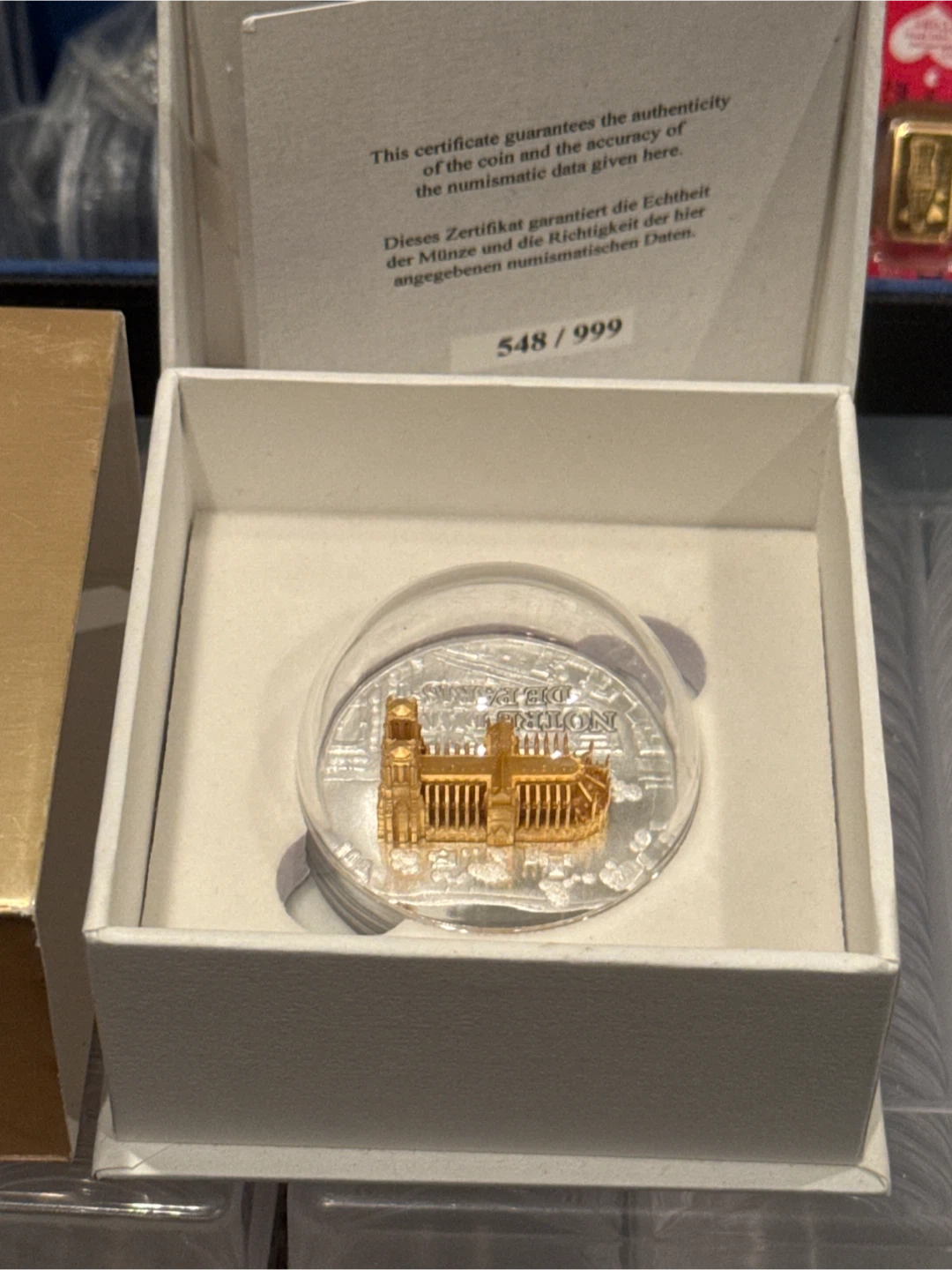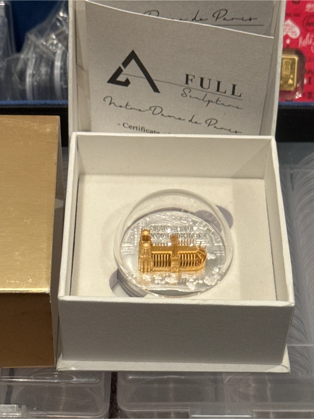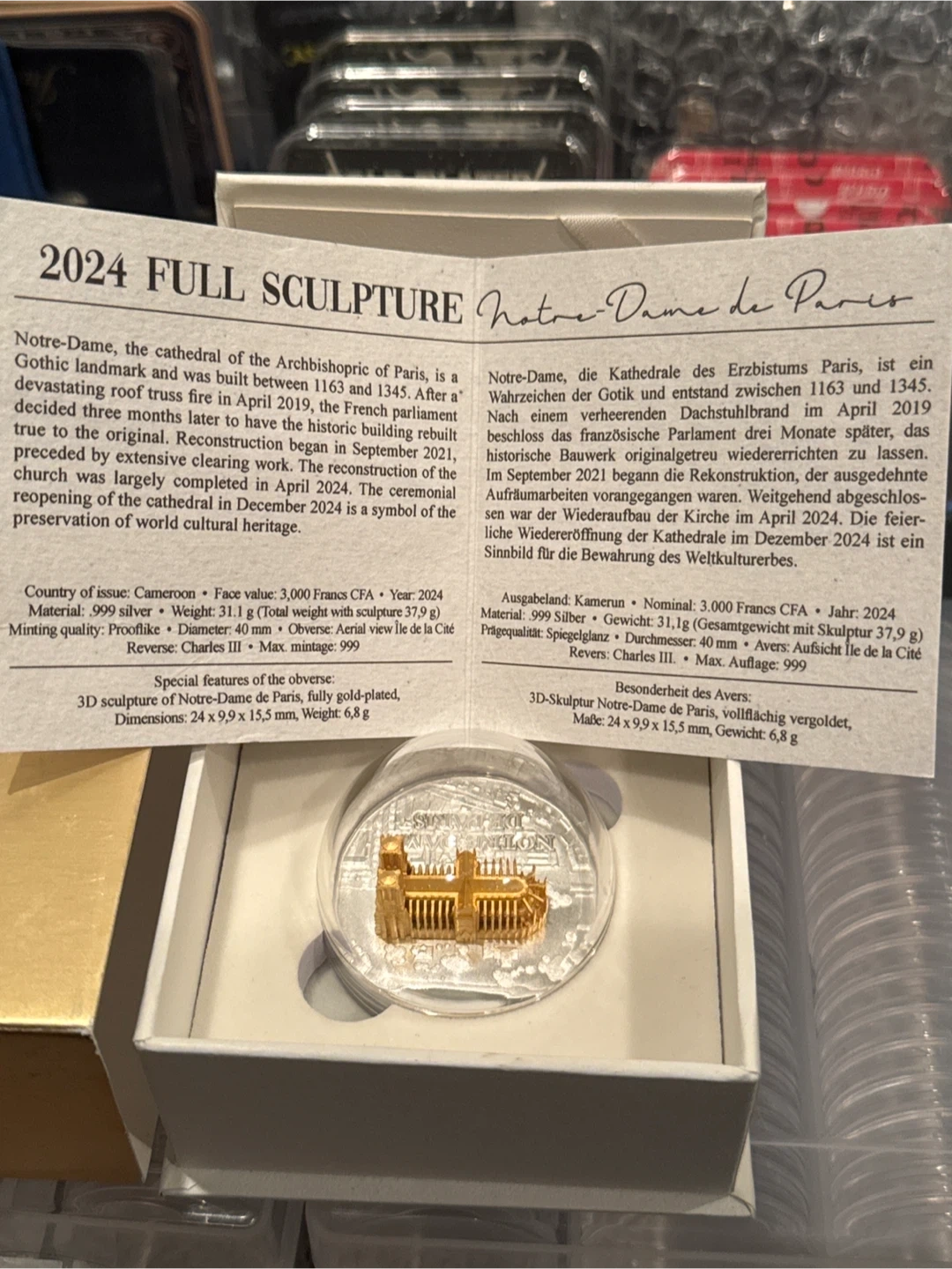 Selling a 2024 Full Sculpture Notre Dame de Paris coin. It's a beautiful 3D sculpture of Notre-Dame de Paris, fully gold-plated, on a 999 silver coin. The dimensions are 24 x 9.9 x 15.5 mm and it weighs 6.8 g. The coin comes with a certificate guaranteeing its authenticity and the accuracy of the numismatic data given here. It's in excellent condition and comes in its original box